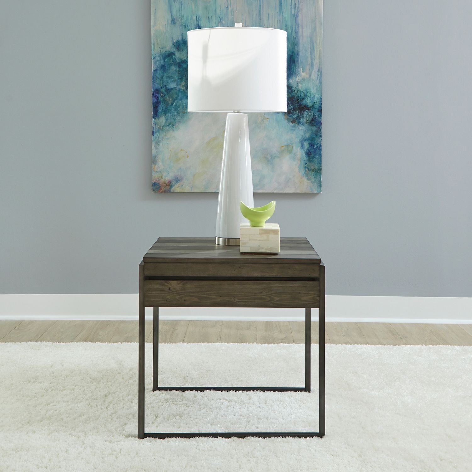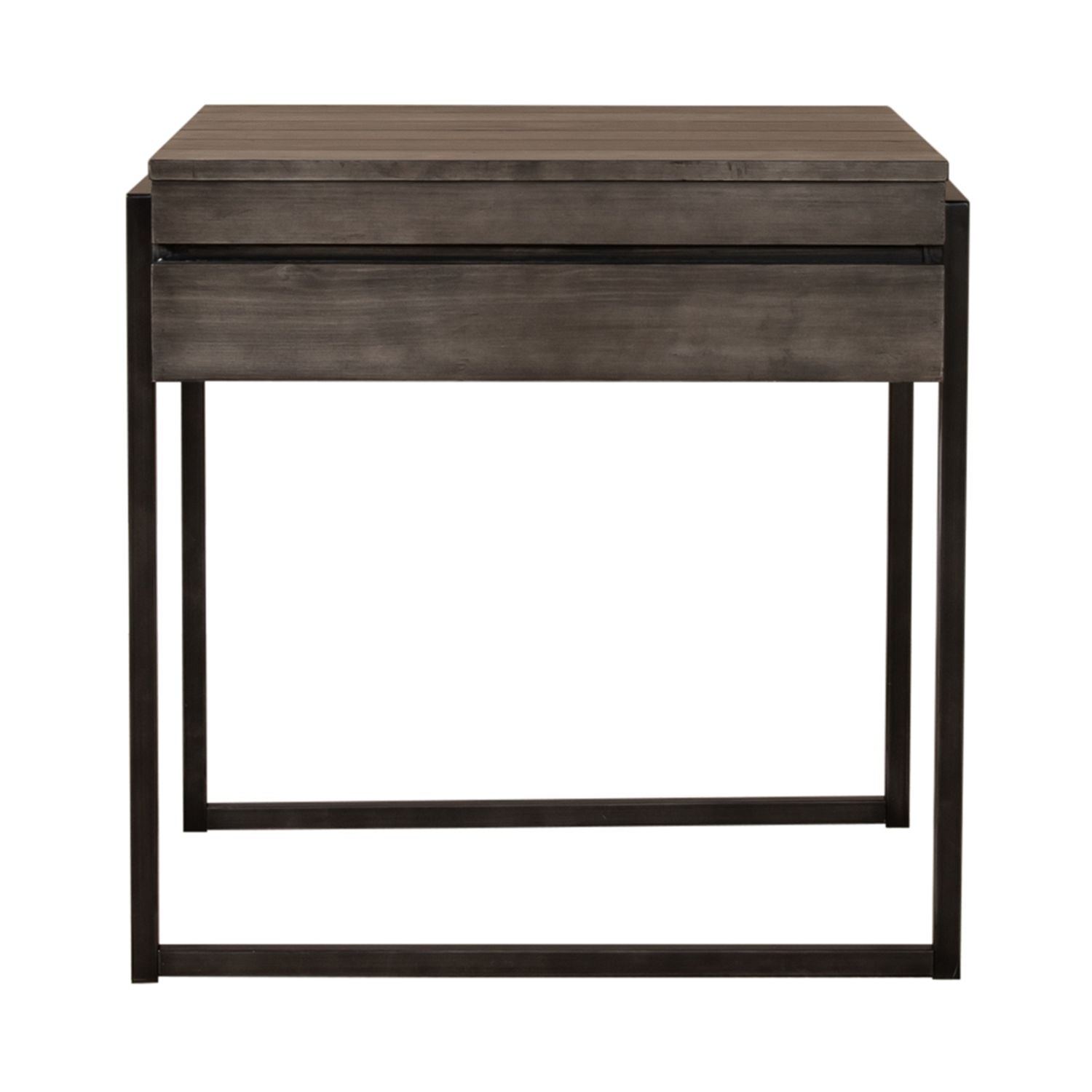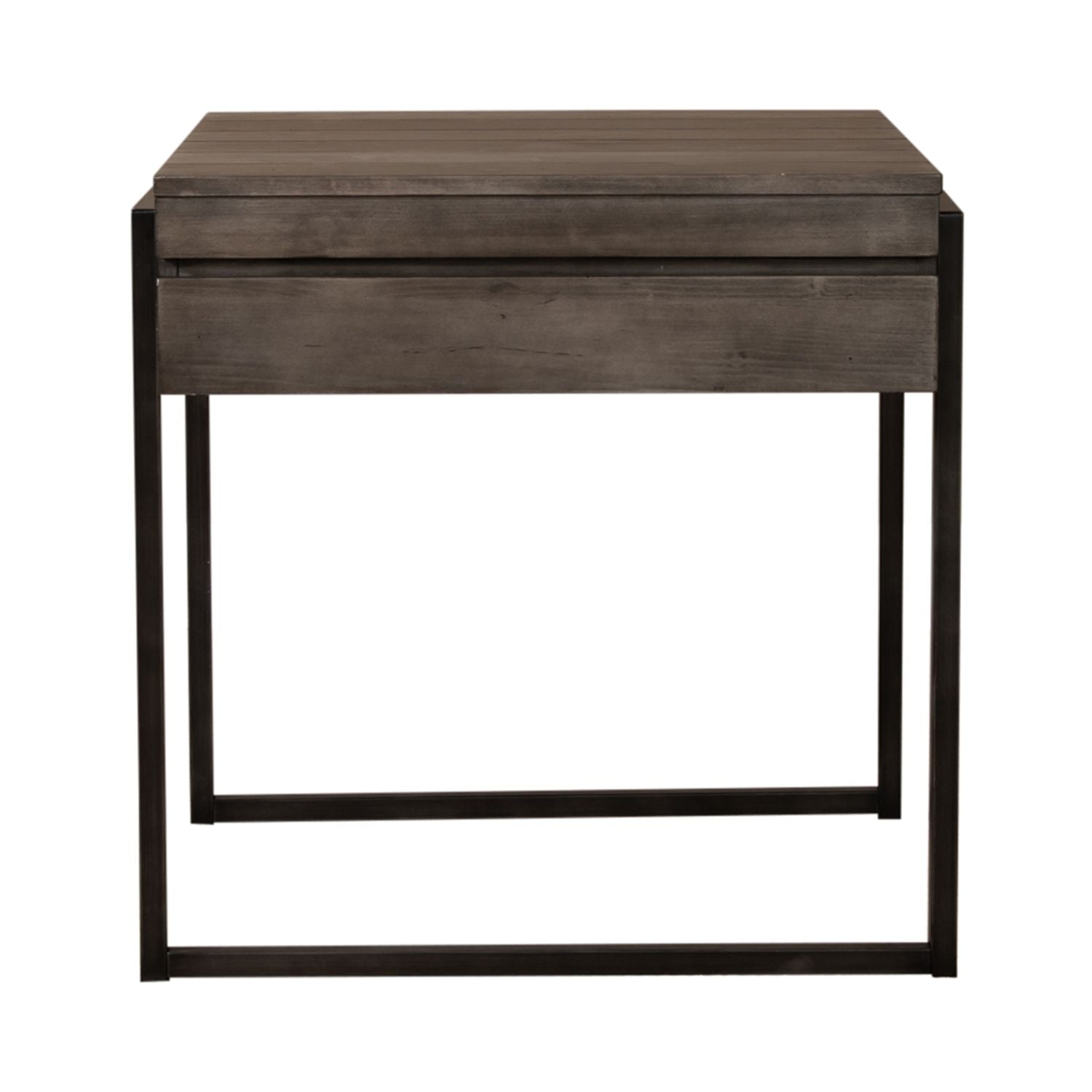 Accent your space with the urban style Gateway end table. Crafted of pine veneers with powder coated metal tubing, this piece features a weathered gray finish, one fully stained full extension drawer for additional storage, groove lines that create a planked look, anchored by tube metal legs. This simplistic style end table would be a wonderful accent piece in any home.