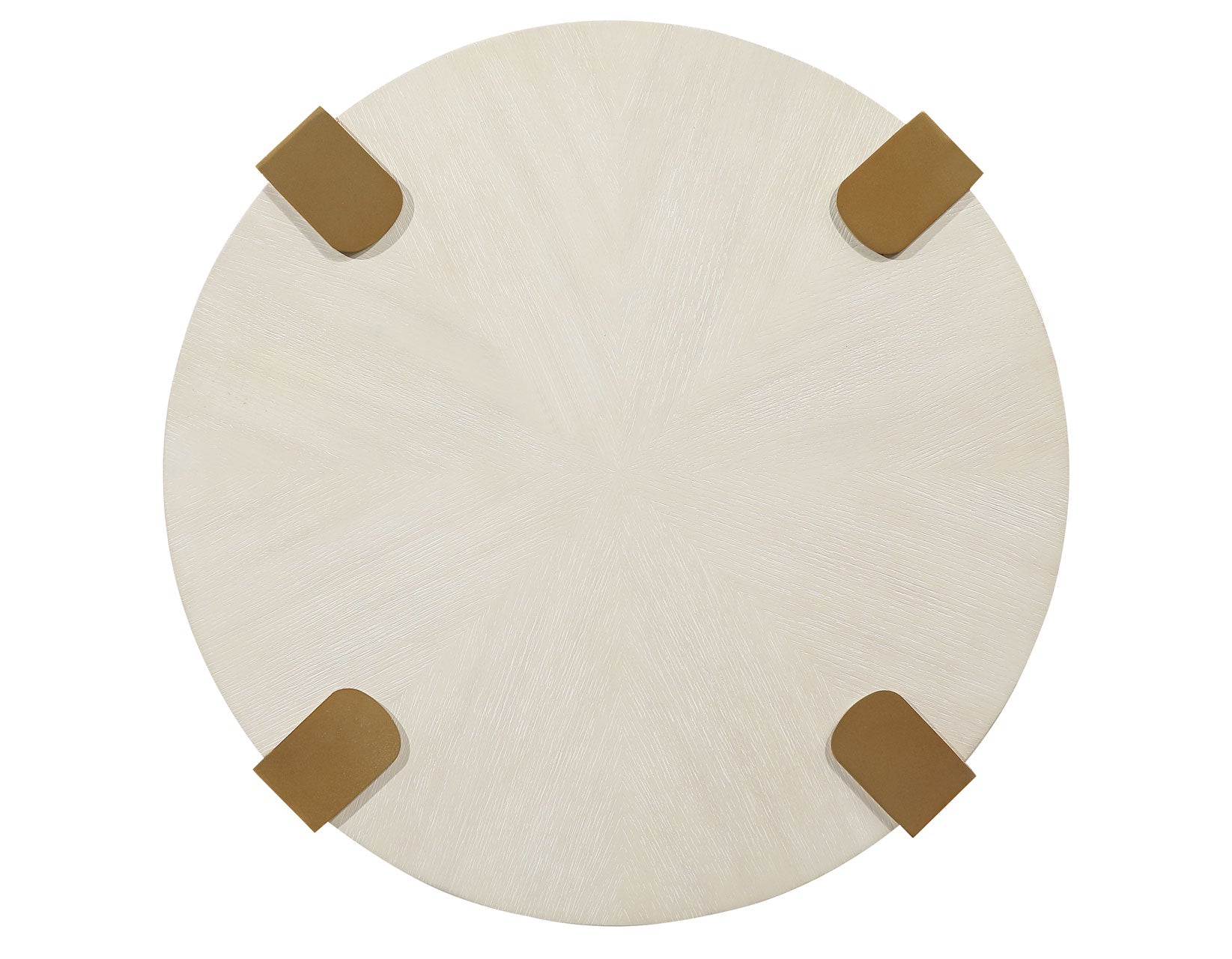 The Gracie White End Table is a stunning blend of modern industrial charm and elegant design. With a round, flowing silhouette and washed white finish, it showcases oak veneers in a mesmerizing sunburst layup. The satin gold finished metal legs, geometrically shaped and exposed on top, add a bold, contemporary look. Ideal as a side table beside a chair or between upholstered pieces, it brings style and functionality to any room. Light and airy, this distinctive piece brightens up any space with its impressive design.
