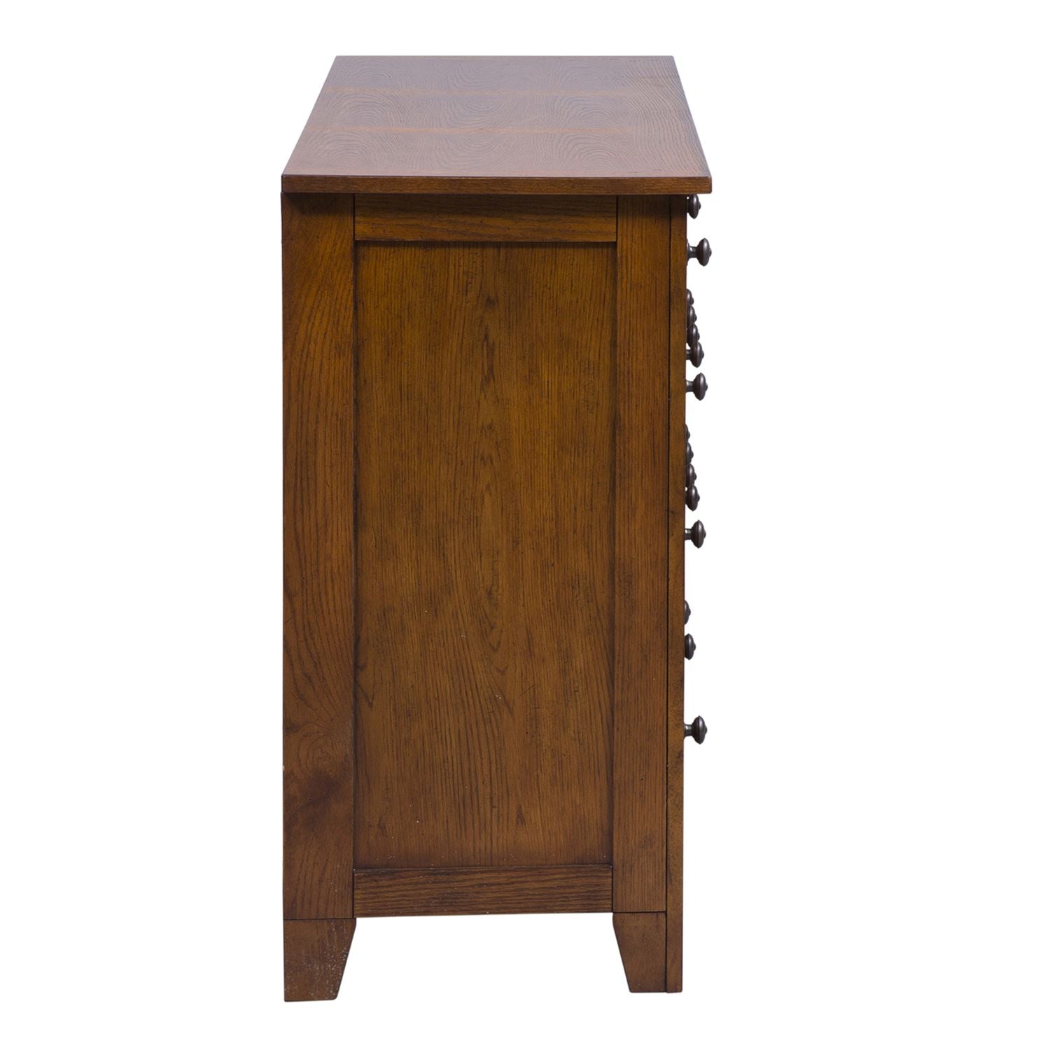 Staple any room with this rustic American 7-drawer dresser. Constructed with select hardwoods with ash and oak veneers, this piece features an aged oak finish, highlighted by wood and peg accents. The seven drawers are perfect for storing all your belongings, all with bottom case dust proofing to ensure your clothing is protected.