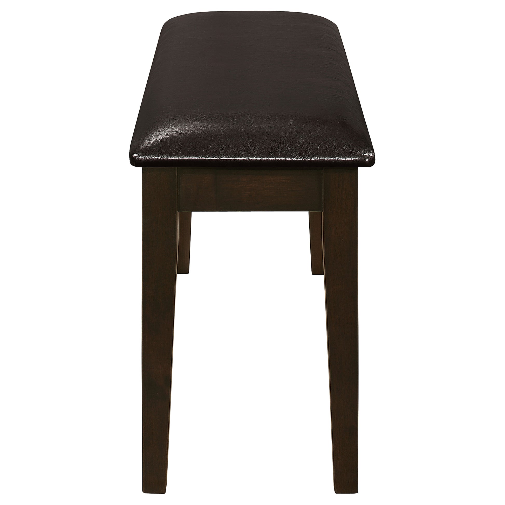 This five-piece dining set brings a perfect blend of everyday comfort and timeless style. Crafted from solid rubberwood, engineered wood, and okume veneer, the rectangular table features clean lines and tapered legs in a rich cappuccino finish. The matching chairs and bench offer padded seats upholstered in dark brown leatherette for a warm, inviting look. Ideal for family meals or casual gatherings, this versatile dining set adds a refined yet approachable touch to contemporary or transitional interiors.