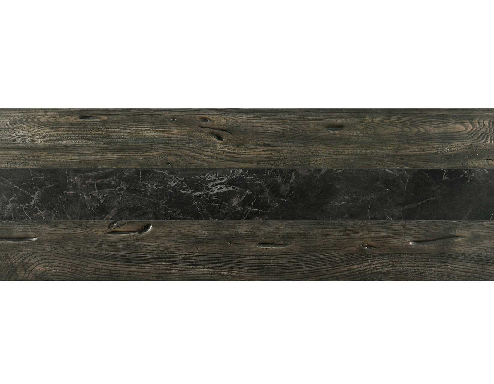 The Harper Sofa Table is a masterful blend of casual rustic charm and mid-century modern elegance. Crafted with ash veneers in a distressed dark driftwood finish and a striking sintered stone inlay, it’s a mixed-media gem that is the perfect behind the soft table, hallway hub or small entertainment unit. Its canted iron legs add a touch of retro flair, while a bottom and middle shelf offer ample space for display or storage. This table is an ideal centerpiece for a casual yet modern living room, offering both style and functionality.