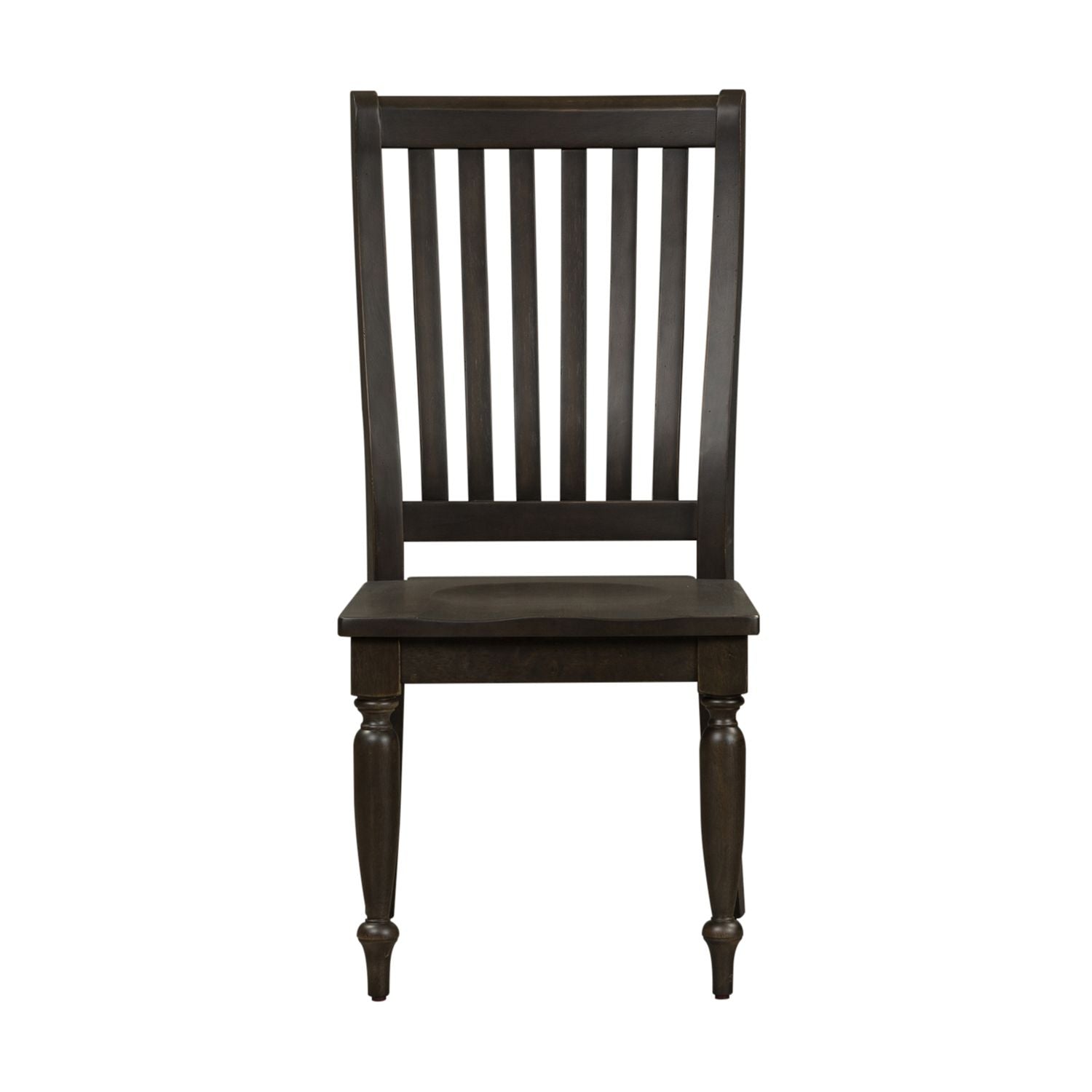 Sit in comfort and style with the Harvest Home slat back side chair. Crafted of rubberwood solids, this piece features a chalkboard finish, shaped wooden slat back, nylon chair glides to protect your flooring, saddle shaped wooden seat for added comfort, and is anchored by round turned front legs and tapered back legs. This chair is sure to be a great addition to any home. This piece effortlessly creates a casual look with a classic feel.