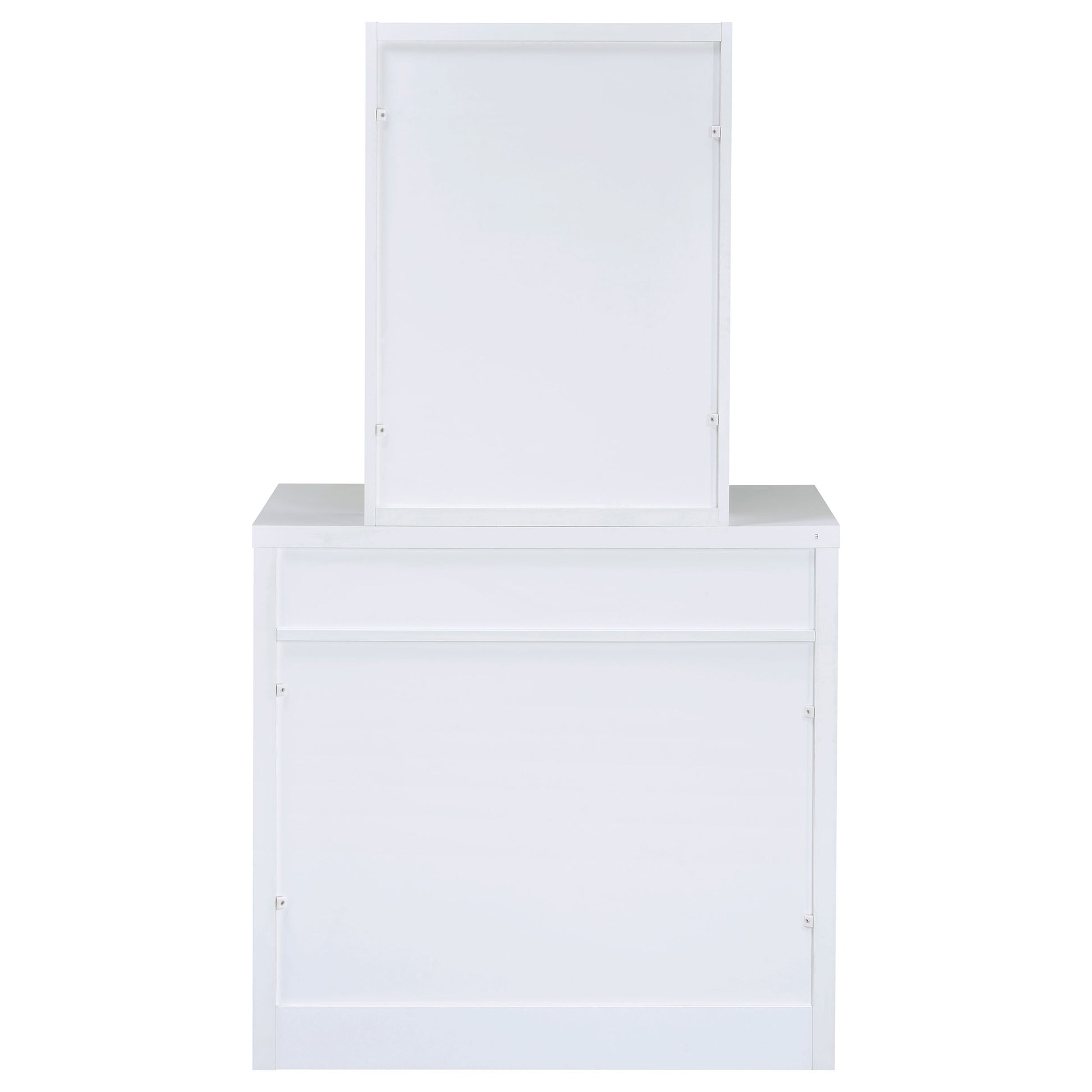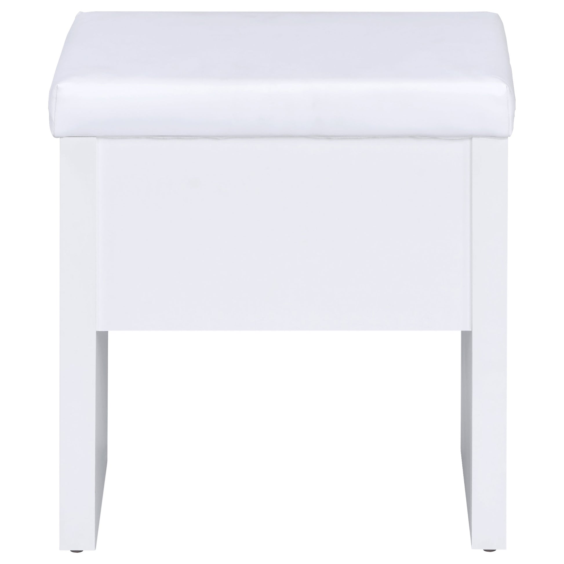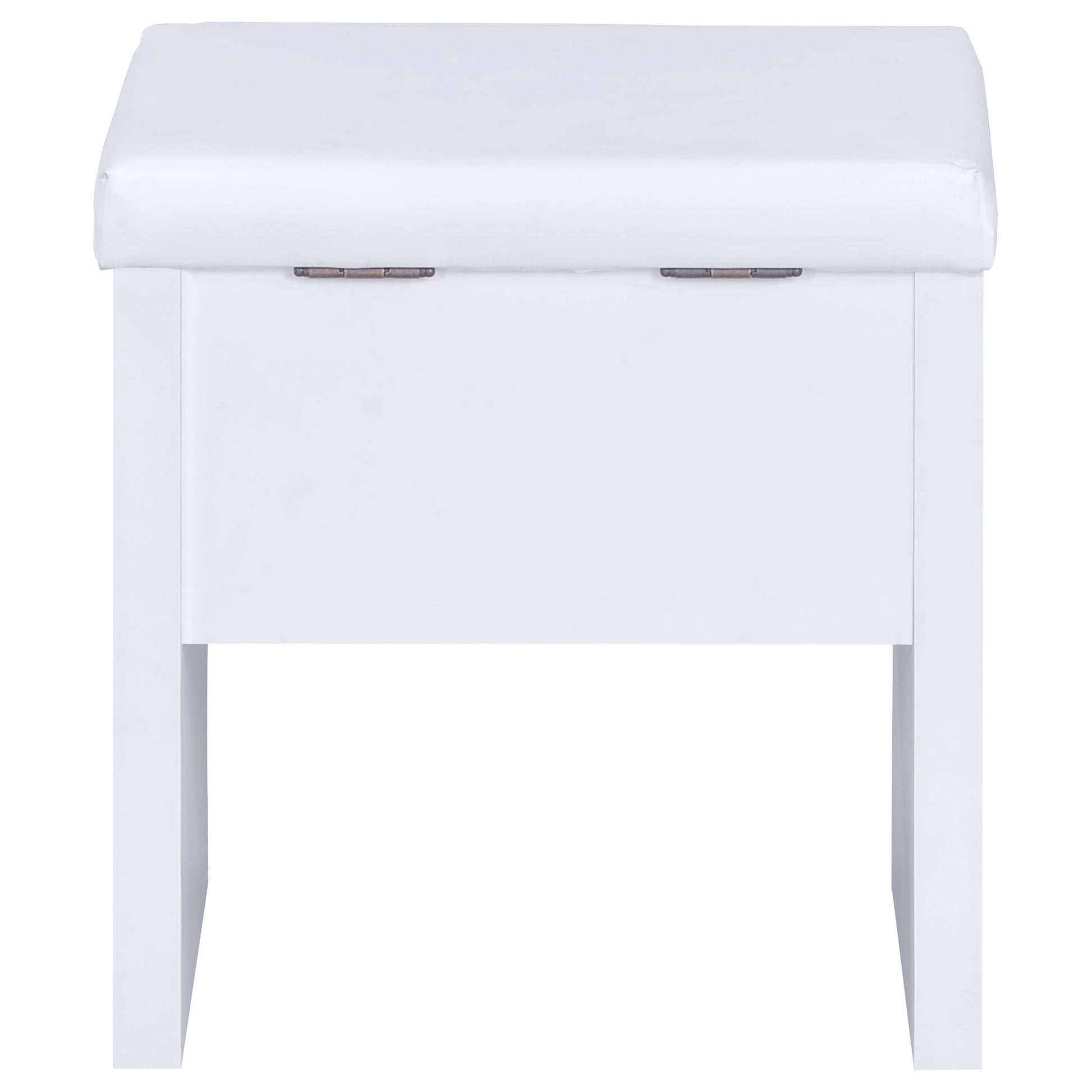 Contemporary white vanity looks great in a modern-style bedroom or dressing room and comes designed to hold your secrets better than a BFF. Pull-out drawer is spacious and compartmentalized for organization to get ready in a hurry (on those rare occasions). The large mirror slides open to reveal concealed jewelry storage compartments. Upholstered stool opens to reveal yet another storage area. This vanity truly is a woman's best friend.