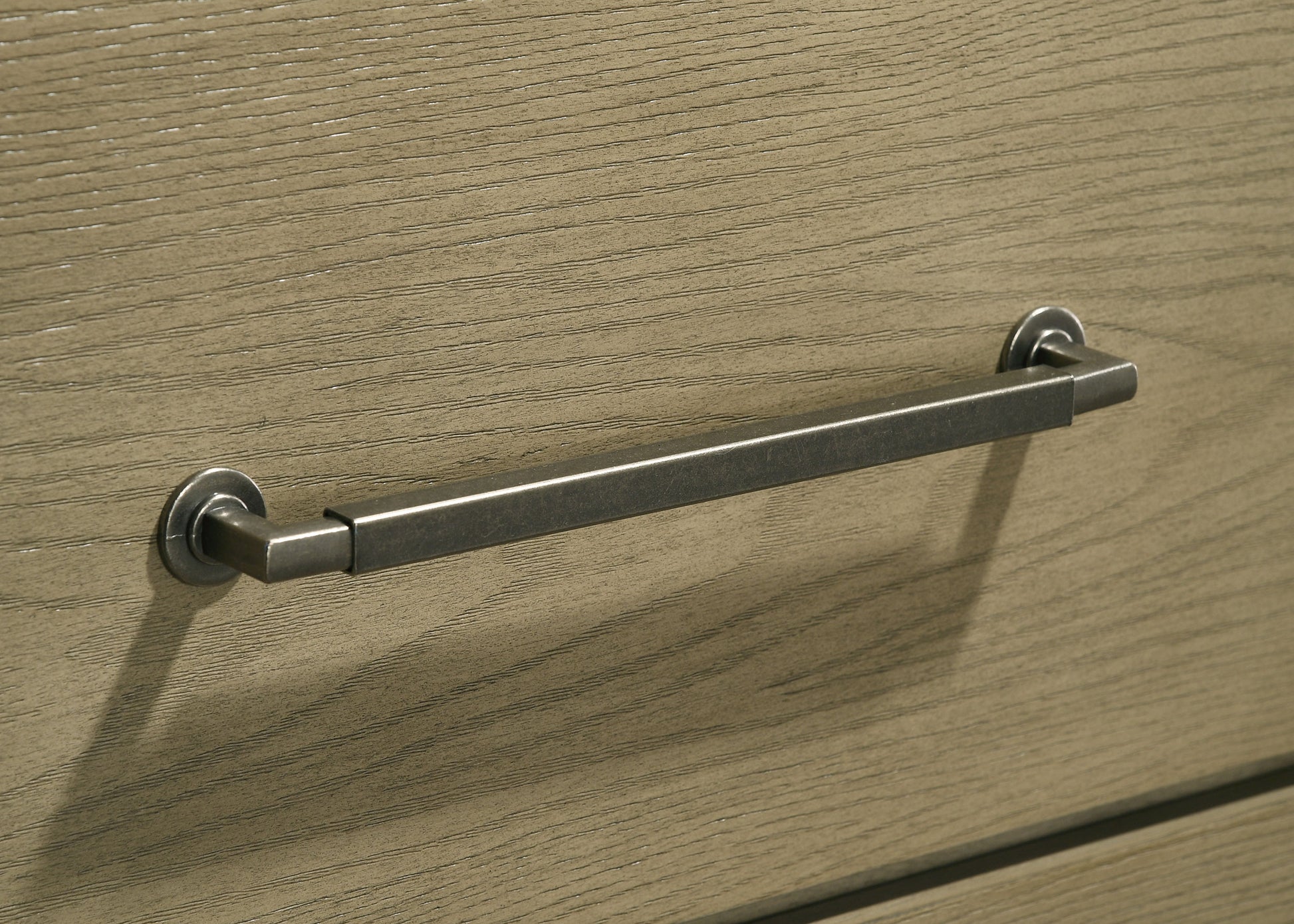 • Antique nickel metal knob and pull handles offer contrast and refined character throughout