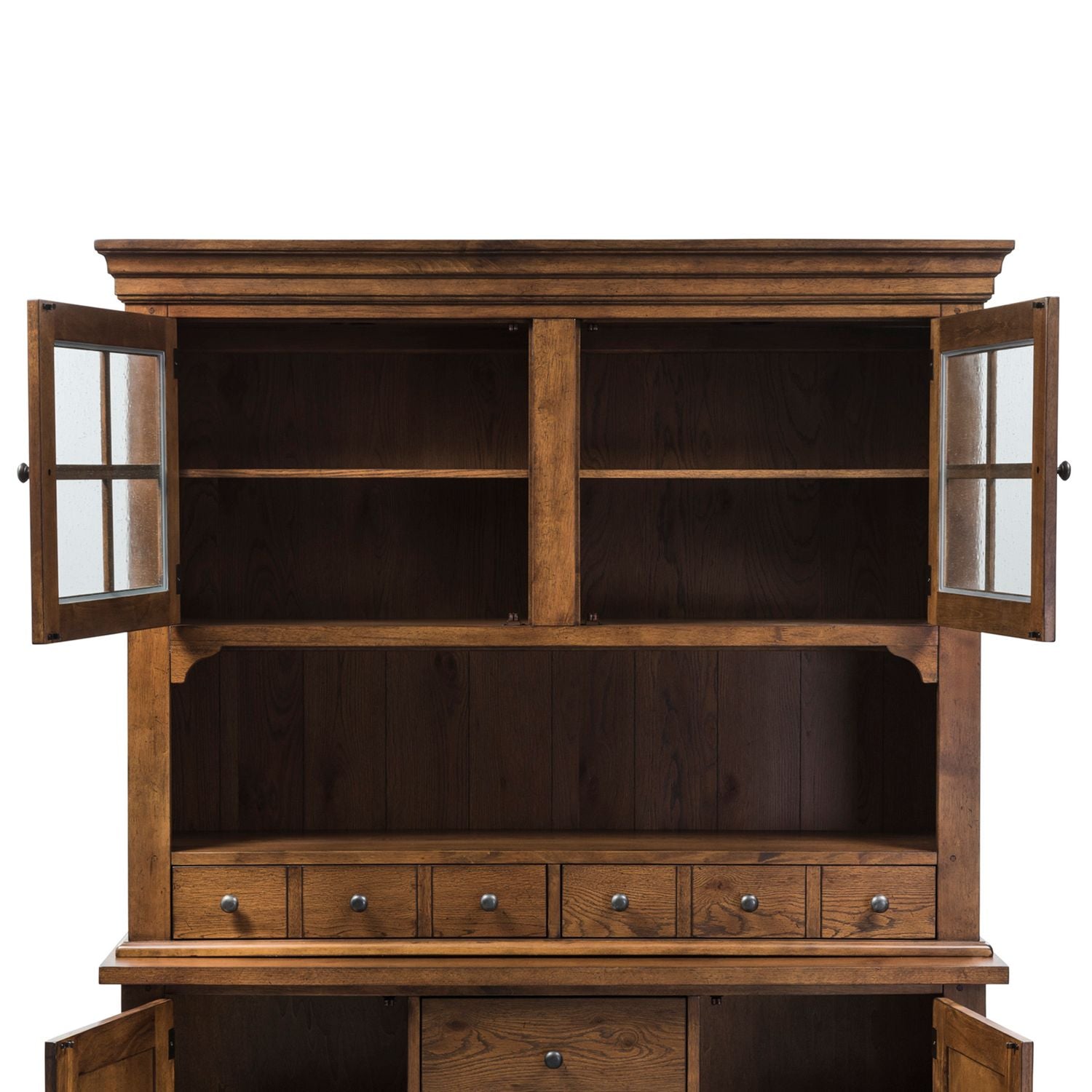 Crafted of rubberwood solids and oak veneers. Features heavy top crown molding, two picture framed doors with seeded glass, one shelf, two bluff cut apothecary style drawers, wood peg accents and interior lighting. Cannot stand alone. Pair with the buffet for a complete set.