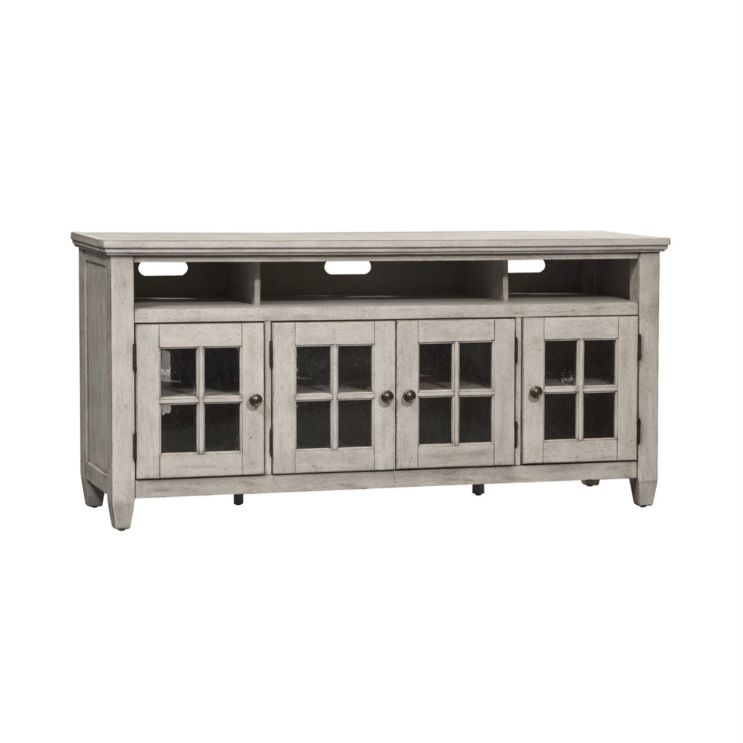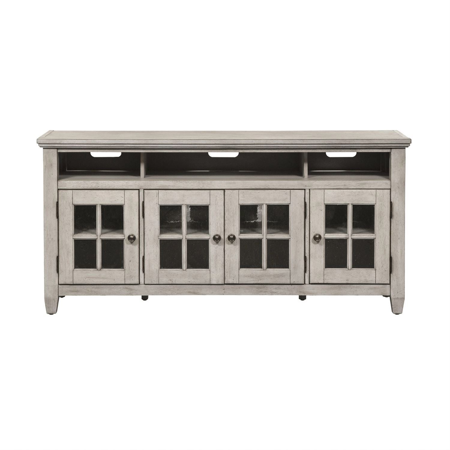Accent your living room with the perfect vintage design, using this unique and stylish 66" tv stand. Crafted with rubberwood solids and cathedral white oak veneers, this piece can accommodate most 72" TVs and features an antique white finish, adjustable shelving, wood framed drawer fronts, raised panels, accented by timeless antiqued brass knob hardware, and has squared pilasters that seamlessly flow into heavily tapered feet. Keep it casual with the simple wood framed doors or step it up with the interchangeable decorative tile look. With today's modern technology in mind, users can enjoy the convenience of the open compartment areas and wire management provisions to hide those pesky wires from your DVD player or gaming console of choice.