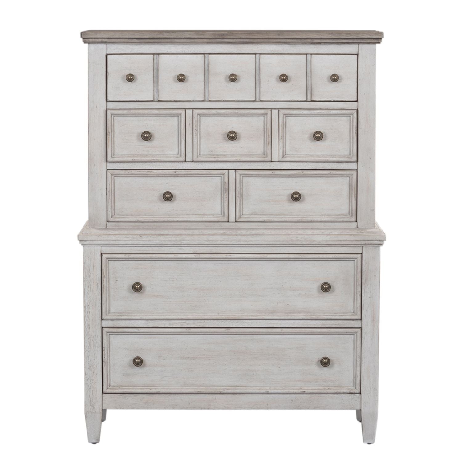 Elevate your farmhouse style home with the Heartland optional California king panel bed, dresser, and mirror. Crafted of rubberwood solids with cathedral white oak and birch veneers, this kit features an antique white finish with tobacco tops, planked tops and end panels, full extension drawers with premium felt lining in the top drawers and cedar lining in the bottom drawers, wood framed drawer fronts, and is accented with antique brass knob hardware. This optional panel bed features beautiful antique ceiling tile panels, heavy top crown molding and raised panels on the footboard. The dresser offers optimal storage with nine drawers including a unique bluff-cut top center drawer. Pair the landscape mirror with this dresser, that offers a beveled edge and bead molding, and is anchored by bolt-on supports. The chest offers five drawers but gives the illusion of many more. The nightstand is unique in that it offers you one drawer as well as two open stationary shelves in front of a planked back panel. Utilize the nightstands built in charging system, complete with two outlets and two USB ports. Add this one-of-a-kind bedroom kit to your beautiful home.