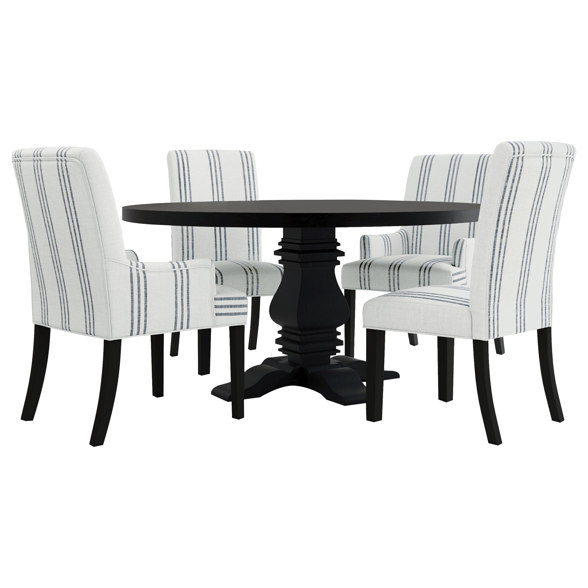• Upholstered in linen-like beige fabric with blue stripes for a casual yet refined look