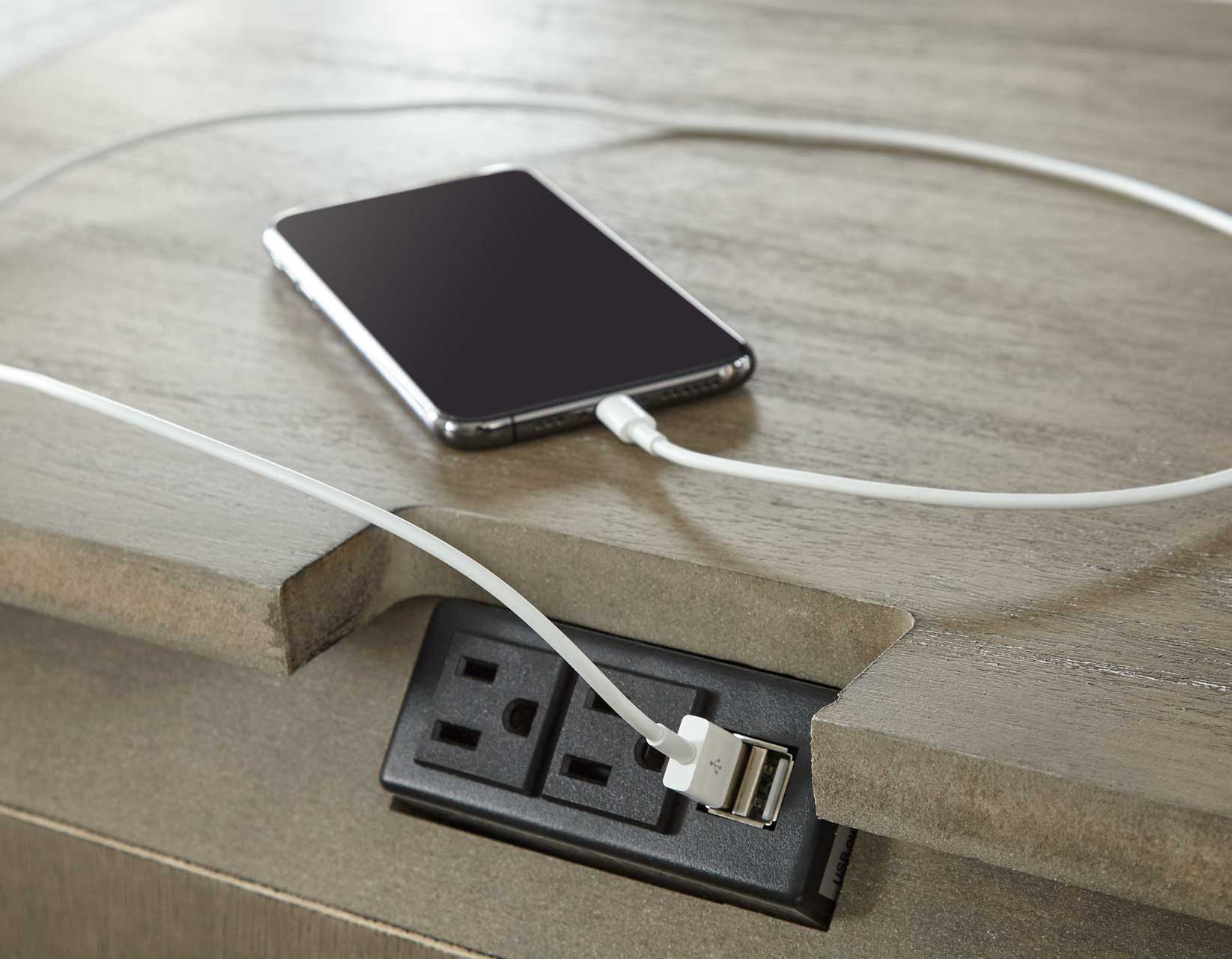 The Highland Park Nightstand comes packed with impressive features; a lustrous Driftwood finish, nickel hardware and substantial wraparound modding on base, top and between drawers. The vintaged styling elegance balances the Intricate details in a package that leans toward a farmhouse inspiration. But there is nothing retro about the built-in function of this piece: a ;built-in charging station ensures all your gadgets stay charged with two outlets and 2 USB chargers, freeing up valuable bedroom outlets. Dual drawers offer great bedside storage options and help complete your bedroom in a stylish configuration.