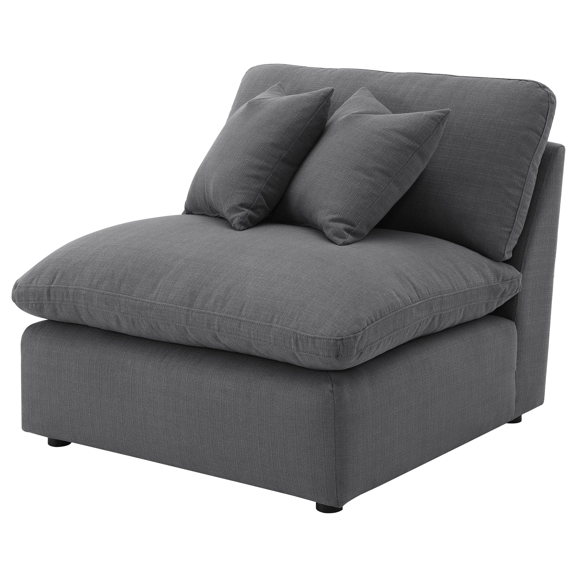 • Armless chair in charcoal fabric with modern lines and tailored stitched detail