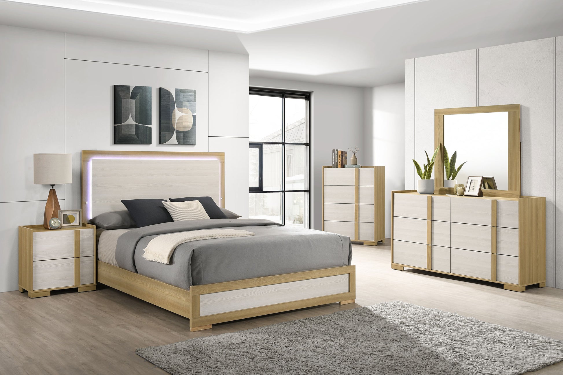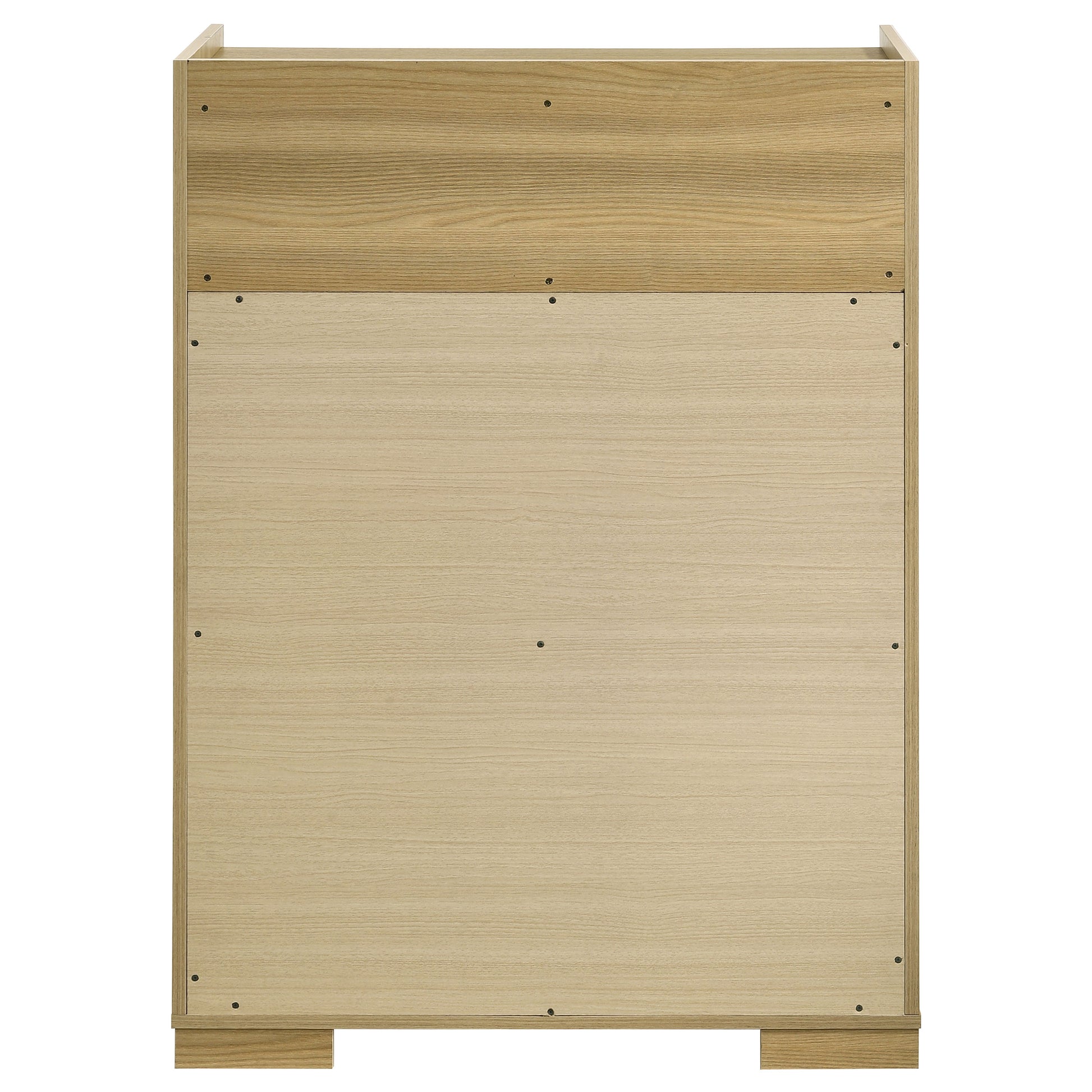 Add a touch of modern elegance to your bedroom with this stylish four-drawer chest. Inspired by contemporary Italian design, this chest features a sleek blend of natural wood tones and crisp white panels crafted from durable, easy-care melamine. The drawers, equipped with metal extension glides and pin-construction joinery, ensure smooth operation and offer ample storage for your clothing and accessories. The vertical lines of the natural finish hardware add a sophisticated touch, perfectly complementing the chest’s clean lines and modern aesthetic. Elevate your home decor with this functional and chic four-drawer chest, designed to bring both beauty and practicality to your space.