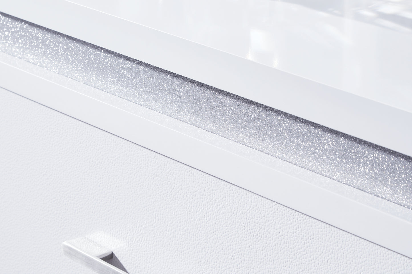 | Details | Includes dresser and mirror, Dresser made with hardwood solids and MDF substrates , Mirror made with solid wood, White paint finish, Dresser with inset acrylic glitter accents, Horizontal metal drawer pulls, 6 drawers with fully finished interiors, dovetail construction and heavy-duty ball-bearing side glides, Textured drawer fronts, Mirror with inset LED lighting; 3-way dimmer switch, Power cord included; UL Listed | |
