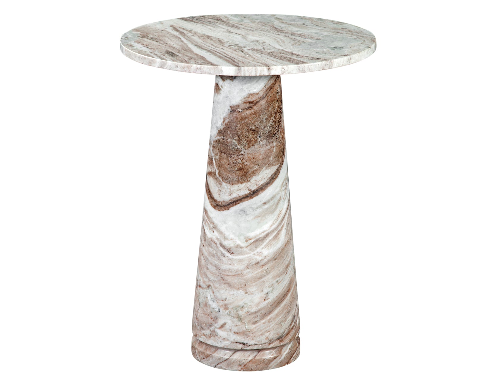 The Joni Accent Table blends natural elegance with sculptural design. Featuring an 18-inch round Toronto Brown marble top and a graceful teardrop marble base, each table is uniquely veined with rich brown tones and soft white or tan accents. Mined and hand-finished, no two are exactly alike. Perfect beside a chair or as a nightstand, Joni brings warmth, refinement, and organic texture to any space. A true statement piece, this accent table showcases timeless style and the enduring beauty of natural stone.
