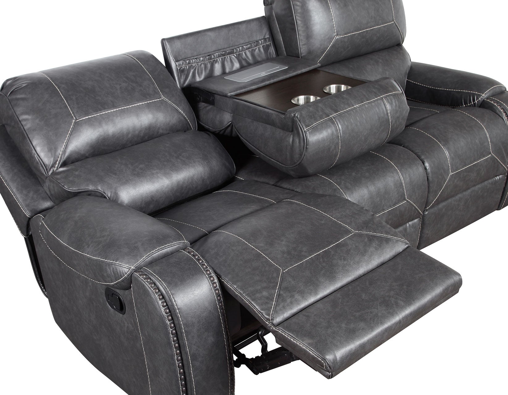 Superior comfort and style are the hallmarks of this motion set. Featuring a leather-like cover with baseball stitching, this ensemble comes with a Sofa with a drop-down console & USB charging station; a Loveseat with dual rocker/recliner ends; and a rocker/recliner Chair with 360-degree swivel. Pewter nailhead trim and padded arms complete this ultimate motion package.