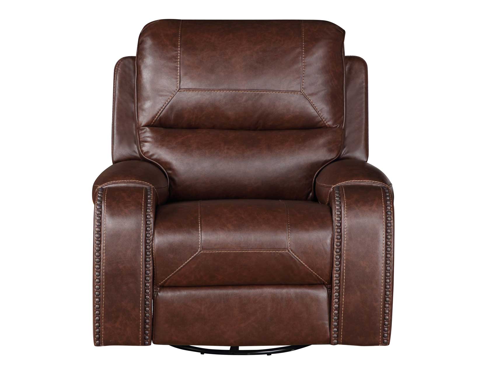 Superior comfort and style are the hallmarks of this motion set. Featuring a leather-like cover with baseball stitching, this ensemble comes with a Sofa with a drop-down console & USB charging station; a Loveseat with dual rocker/recliner ends; and a rocker/recliner Chair with 360-degree swivel. Antiqued brass nailhead trim and padded arms complete this ultimate motion package.