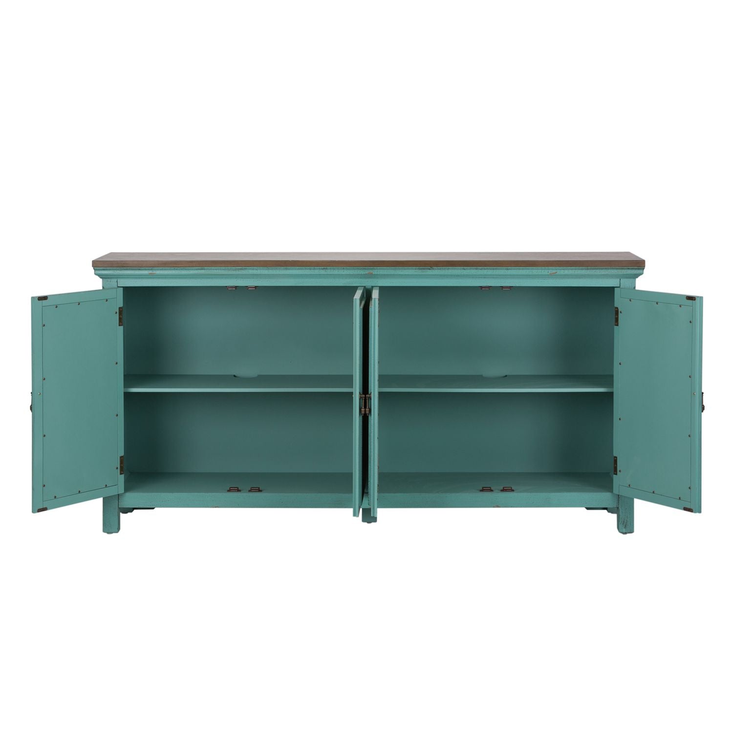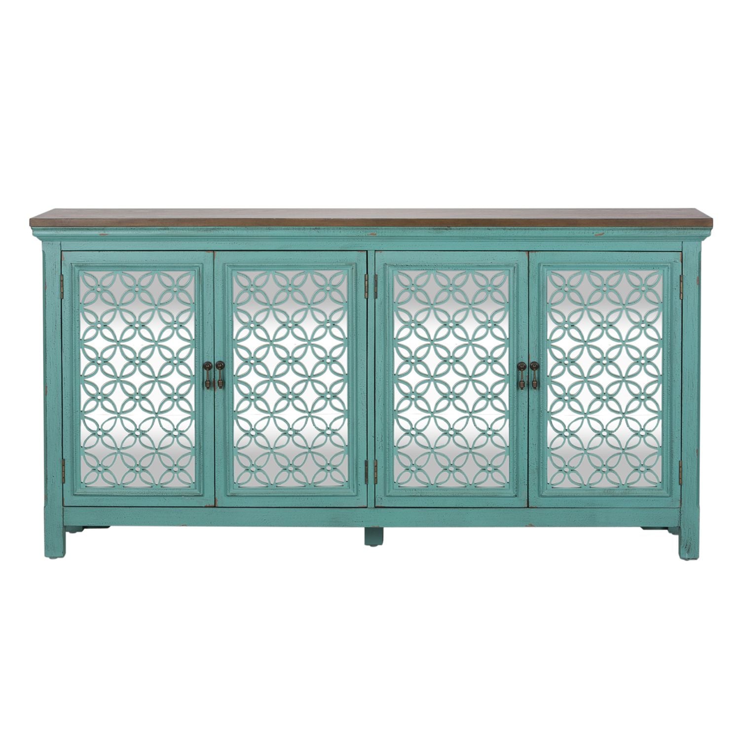 Transform your home with the Kensington 72" accent cabinet. Crafted of Eucalyptus solids and Ash veneers in a wire brushed Turquoise finish and Spice wood tone top. Features four mirrored doors with decorative floral pattern overlays, block feet and one concealed fixed shelf behind doors. A unique piece that will work with any décor from traditional to contemporary.