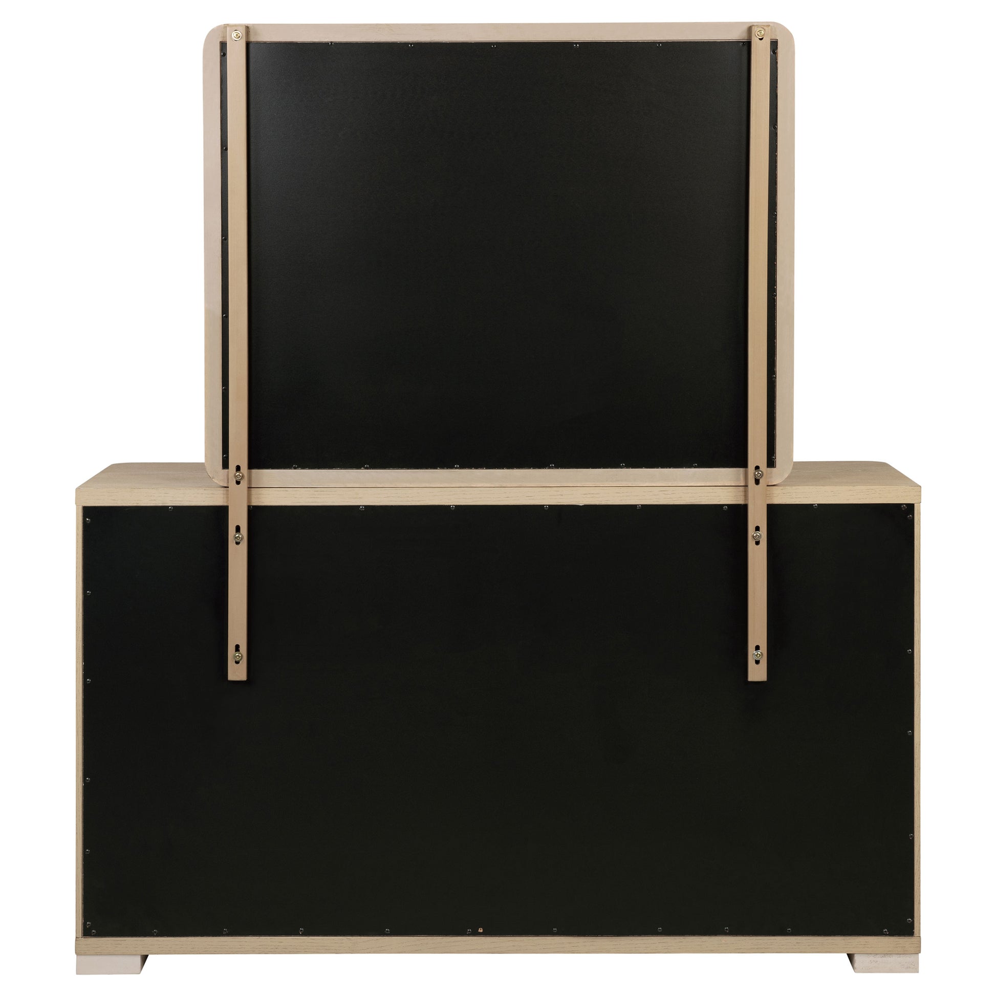 The dresser and mirror set combines function and elegance with its light elm finish and sleek contemporary design. The dresser features six extra-large tinted drawers, each crafted with French and English dovetail construction for durability. Brushed nickel fingertip pulls and rounded corners add refinement, while the matching rectangular mirror completes the look with its clean lines and softly rounded edges, creating a cohesive, modern bedroom ensemble.