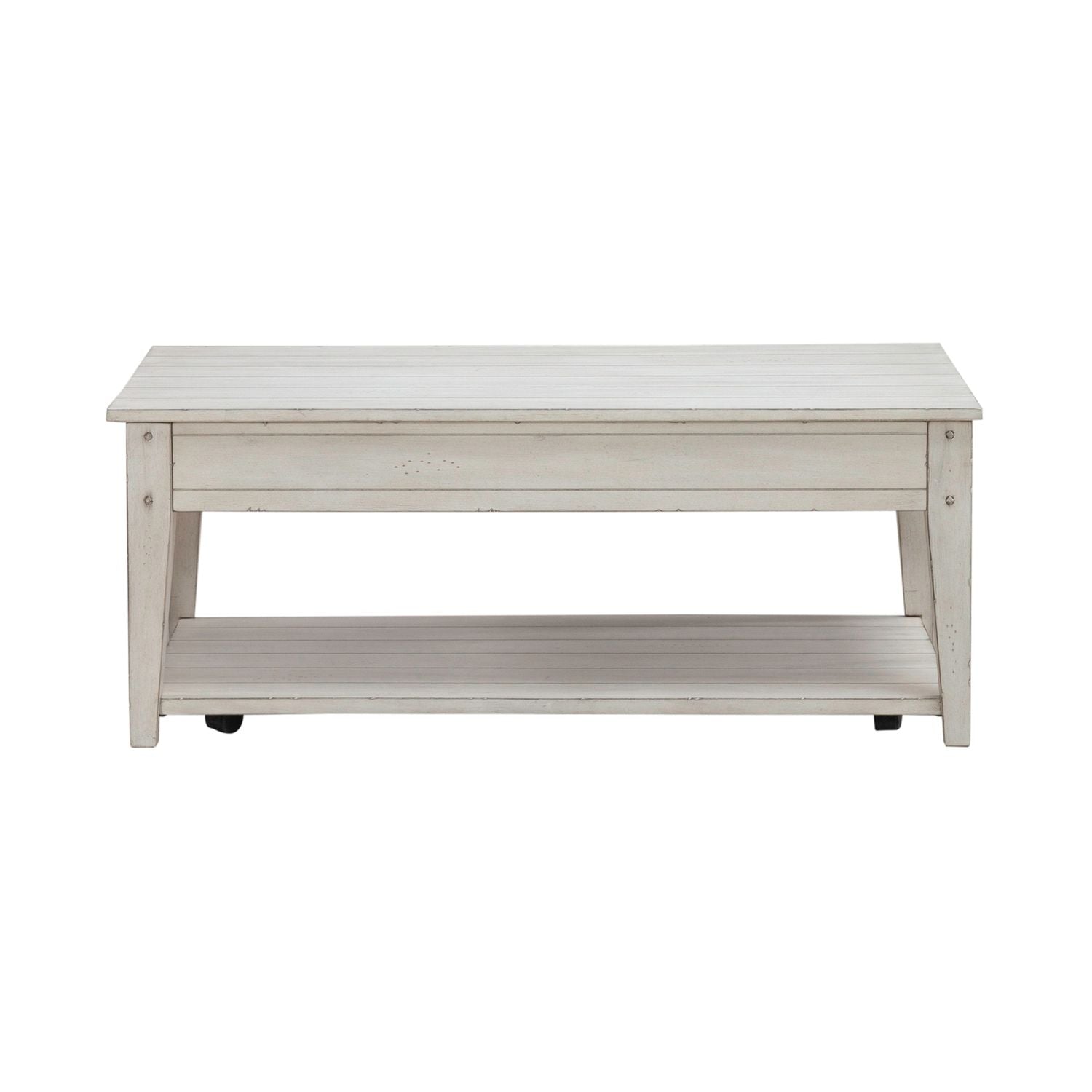A fusion of timeless craftsmanship and modern convenience, the Lake House lift top cocktail table is meticulously crafted using Poplar solids and Oak veneers and features a Weathered White finish. The standout feature of this table is its lift-top design, which reveals additional storage space underneath, perfect for stashing away remotes, board games, or any other living room essentials. This innovative feature allows you to customize the table to suit your needs, whether you're working from home, enjoying a meal in front of the TV, or simply relaxing with a cup of coffee. Crafted with a planked top and bottom shelf, this table exudes rustic charm and provides ample display space for decorative items or everyday essentials. The square tapered legs, adorned with wood and peg accents, add a touch of craftsmanship and lend a sense of authenticity to the design. Whether you're seeking a stylish centerpiece for your living room or a practical storage solution, the Lake House lift top cocktail table offers the best of both worlds, combining form and function to enhance your home decor and simplify your lifestyle.