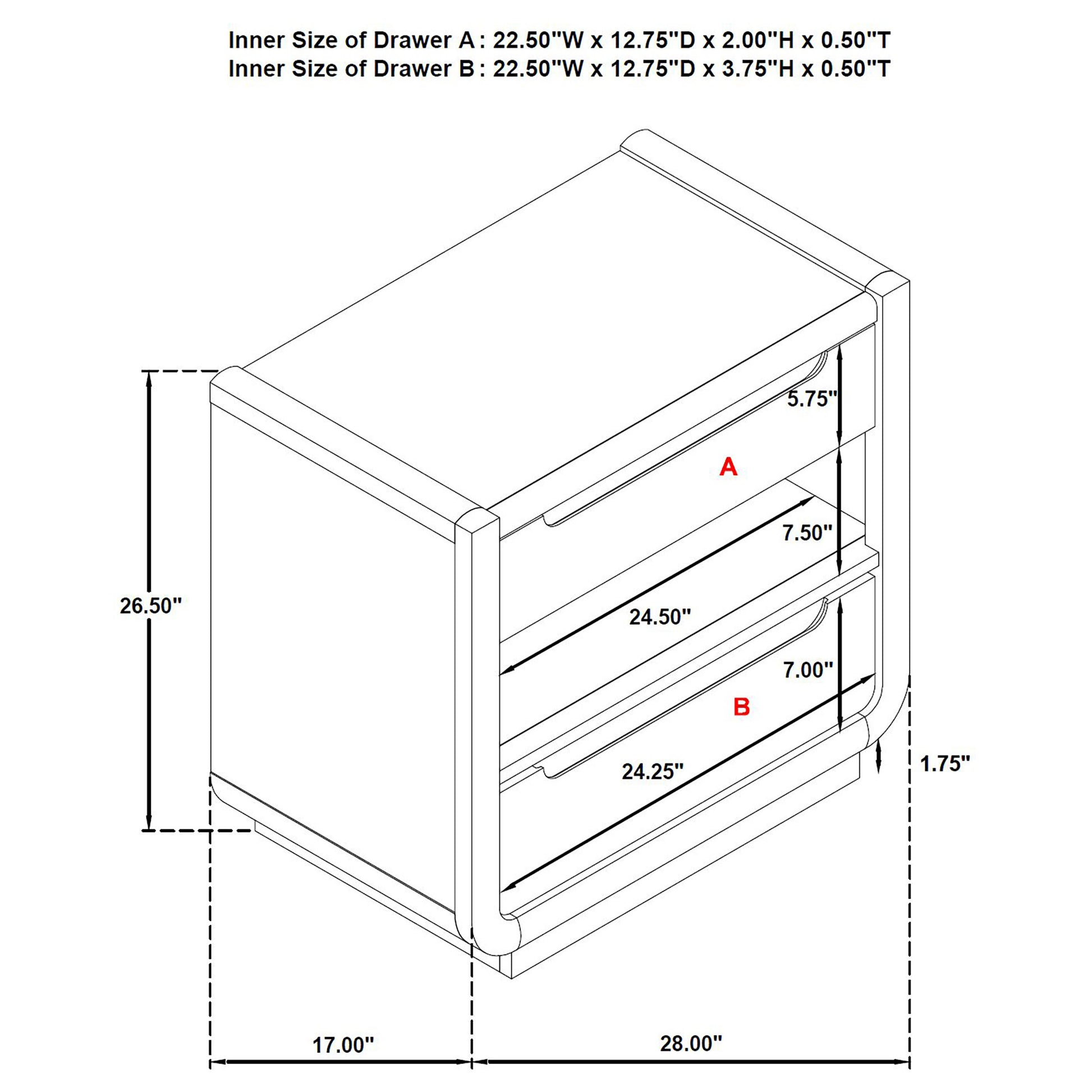 Dark elegance and quiet innovation come together in this two-drawer nightstand, where softened curves and a burnished black finish evoke serene sophistication. A warm LED-lit shelf casts a golden glow beneath the top drawer, creating ambiance for evening hours. Dual USB ports keep modern essentials close, while a black felt-lined drawer cradles delicate keepsakes. Built with soft-closing glides, English dovetail joinery, and a dust panel, this piece blends function with intimate beauty.