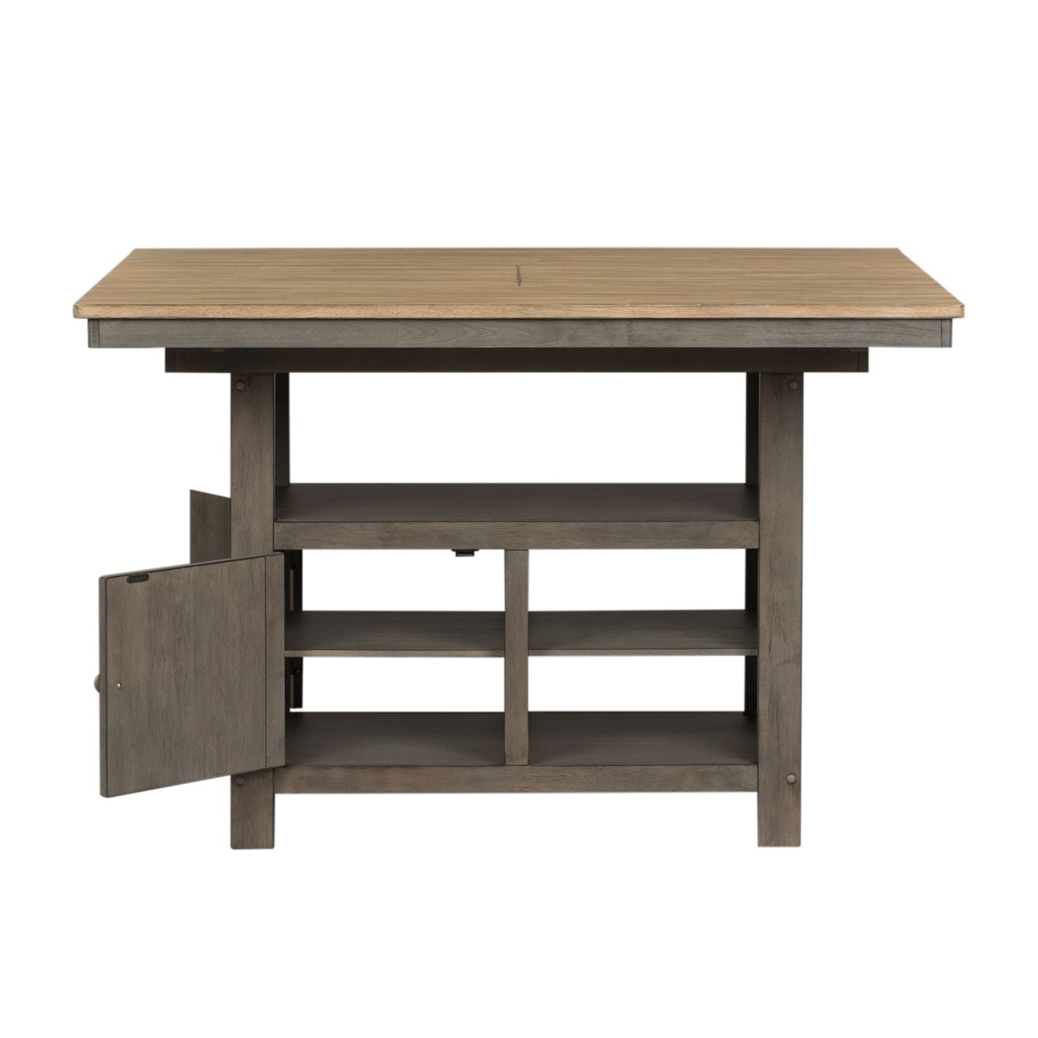 Wow family and friends with the Lindsey Farm kitchen island table. Crafted of rubberwood solids, this piece features a gray and sandstone finish, and is accented with a gray wooden knob hardware. This table features on 18” self-storing leaf on an easy guide system. The storage base features two wood panel doors with one shelf located behind them, a smaller open shelf for storage, and one large open shelf directly beneath the top for display items. The end panels feature a V-shaped pattern. Lindsey Farm offers looks that easily work in today’s homes with style uncompromised and comfort abound.
