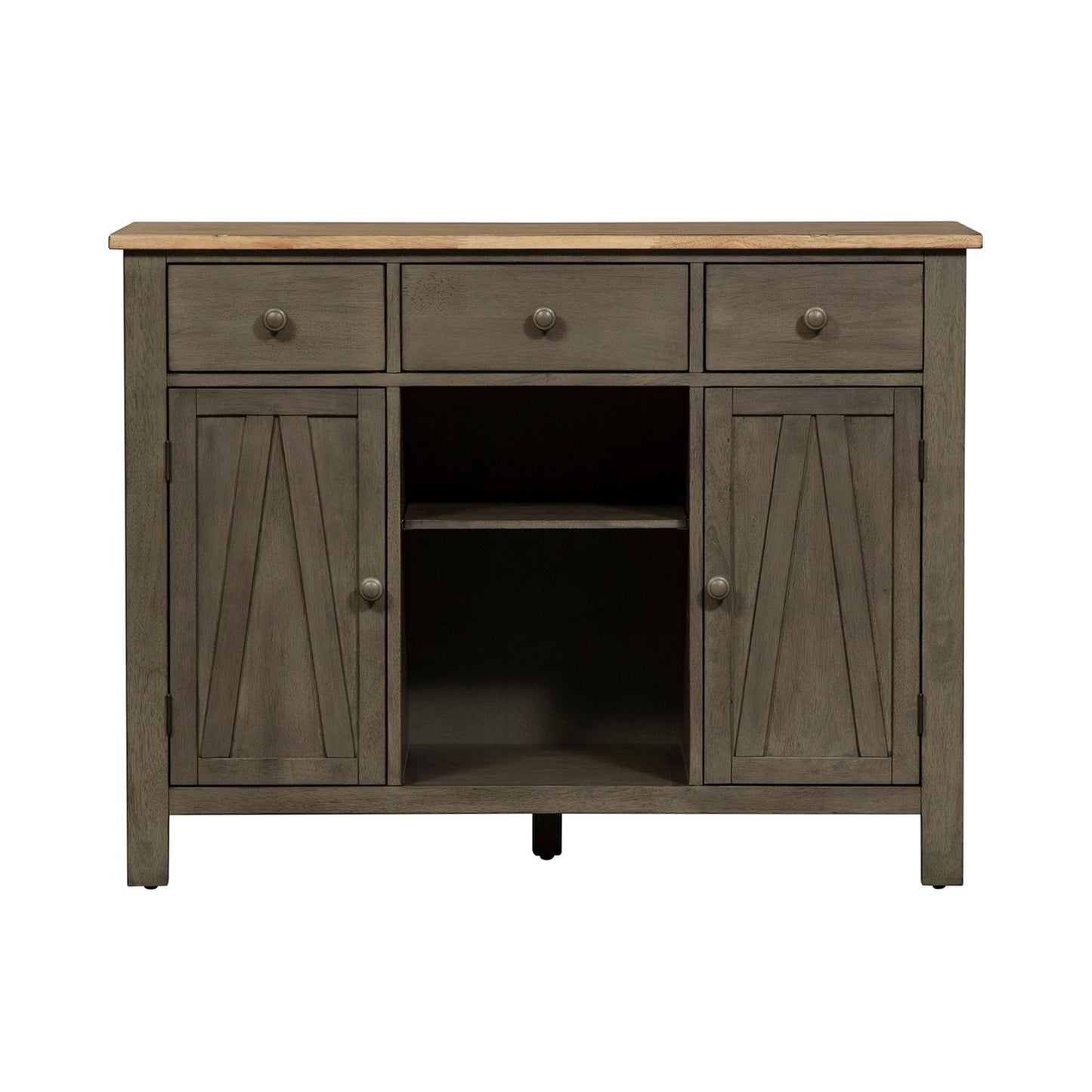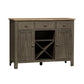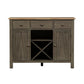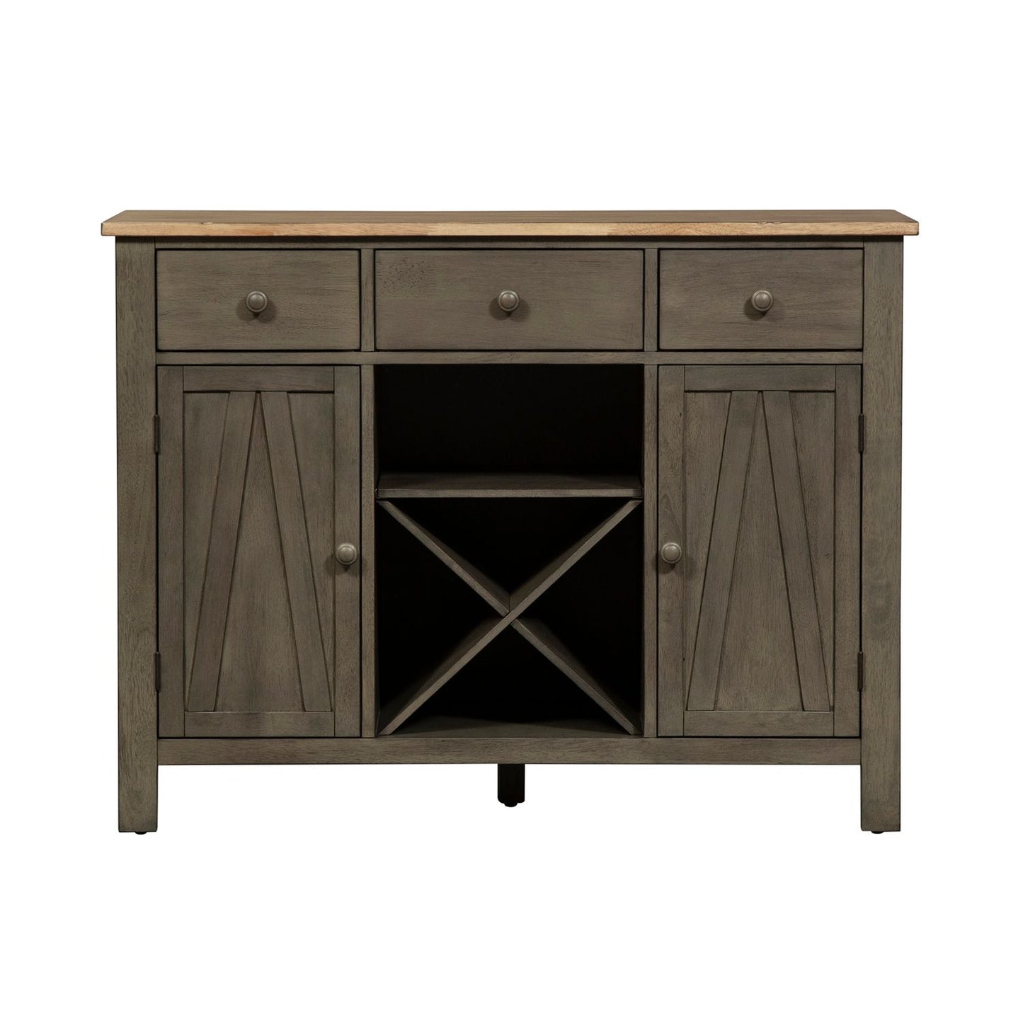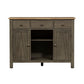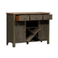 Invite a classic look with a casual feel into your home with the Lindsey Farm server. Crafted of rubberwood solids and veneers with MDF, this piece features a gray and sandstone finish, inverted v design on both doors, levelers to protect your flooring and adjust the height, three drawers accented with gray wood knob hardware, one adjustable shelf behind each door, and removeable x shaped wine shelving. This piece has an alternate finish and offers a look that compliments today's homes with style uncompromised.