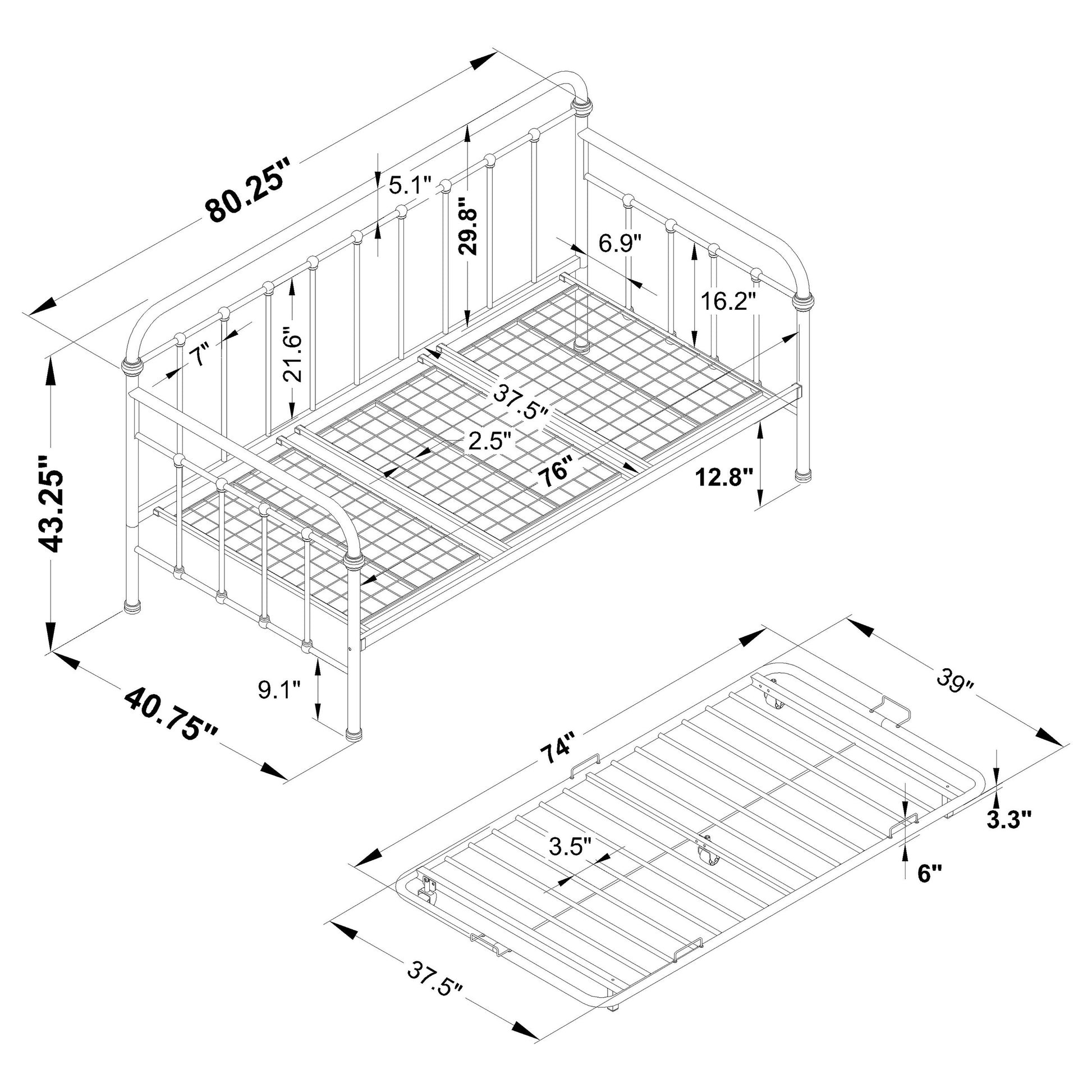 This twin metal daybed with trundle offers timeless farmhouse style with modern functionality. Designed with a sturdy heavy-gauge metal frame, it features a dark bronze powder-coated finish and a classic vertical spindle design. The built-in trundle smoothly pulls out, providing an extra sleeping space ideal for guests. Perfect for small spaces, this daybed combines durability, versatility, and vintage-inspired elegance.