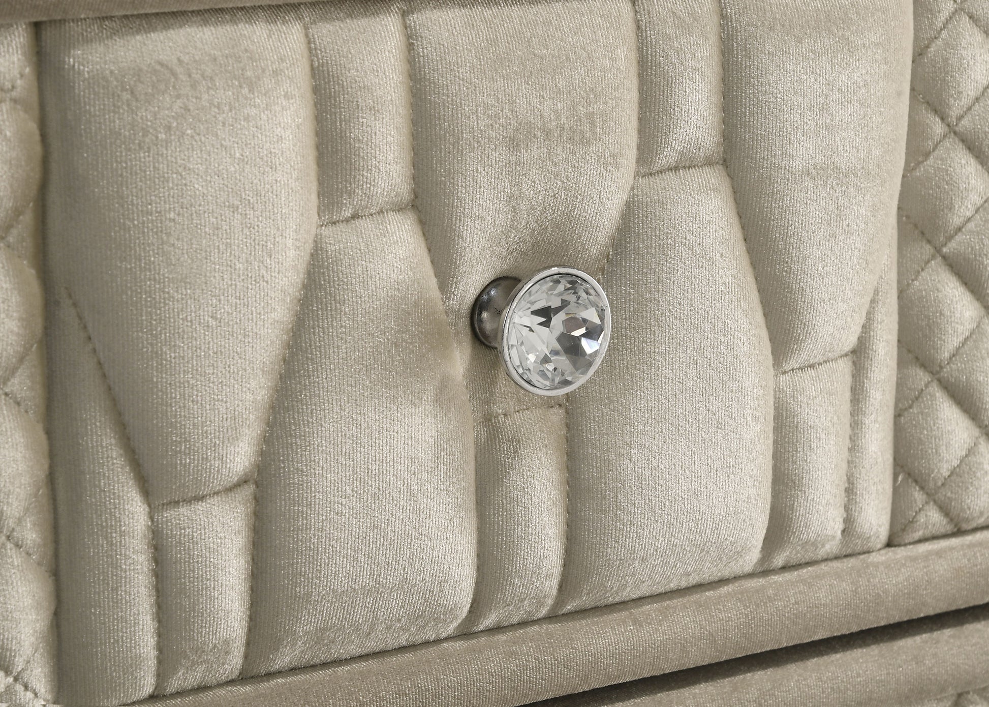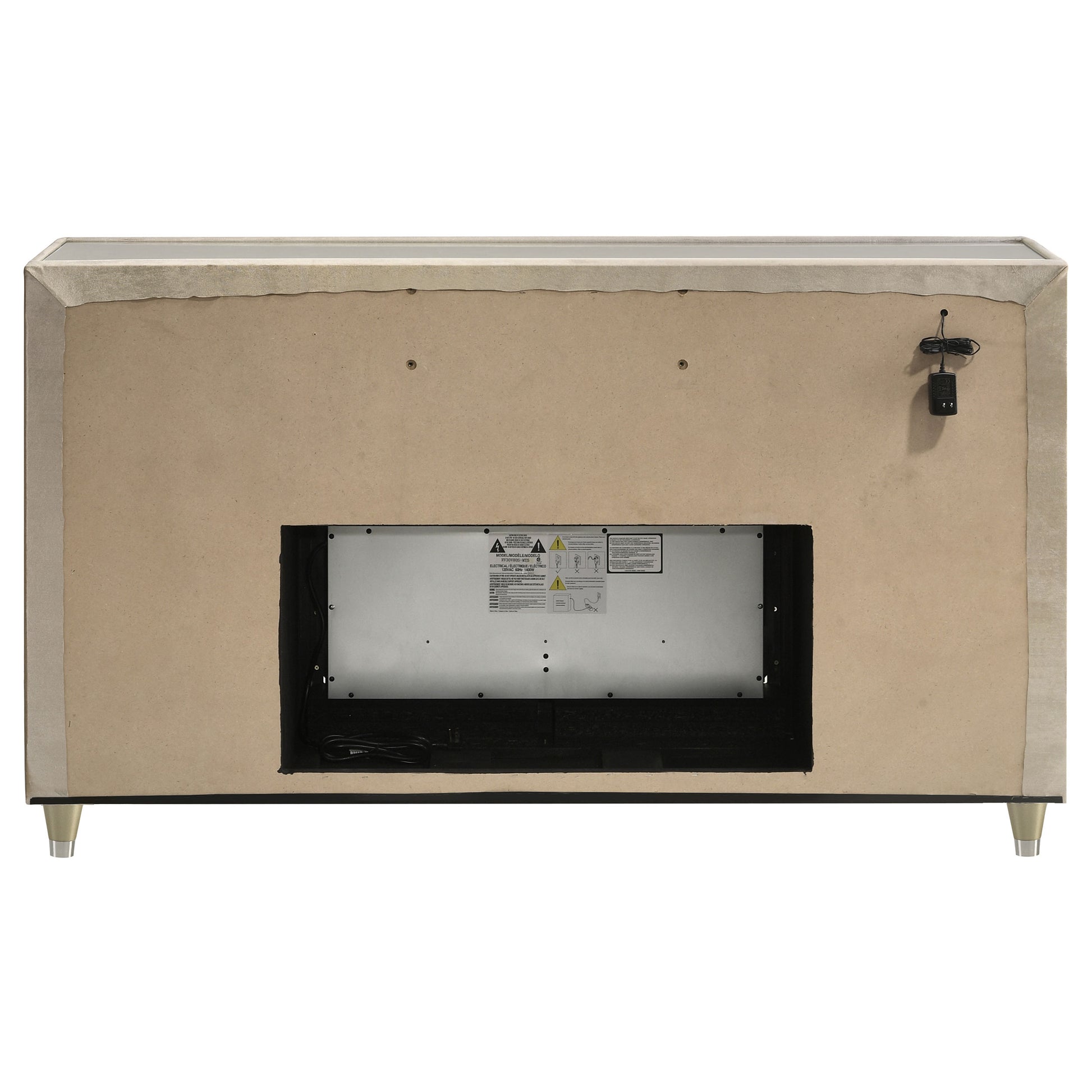Infuse your space with cozy glamour in this eight-drawer flame box dresser, richly upholstered in ivory and camel velvet. A built-in LED flame visualizer is framed by clear tempered glass and acrylic details, while crystal knobs and quilted velvet drawers shine with elegance. LED case lighting and a wireless remote enhance function, while brown felt-lined top drawers, dovetail joints, and heavy-duty glides provide strength and finesse atop solid rubberwood legs.