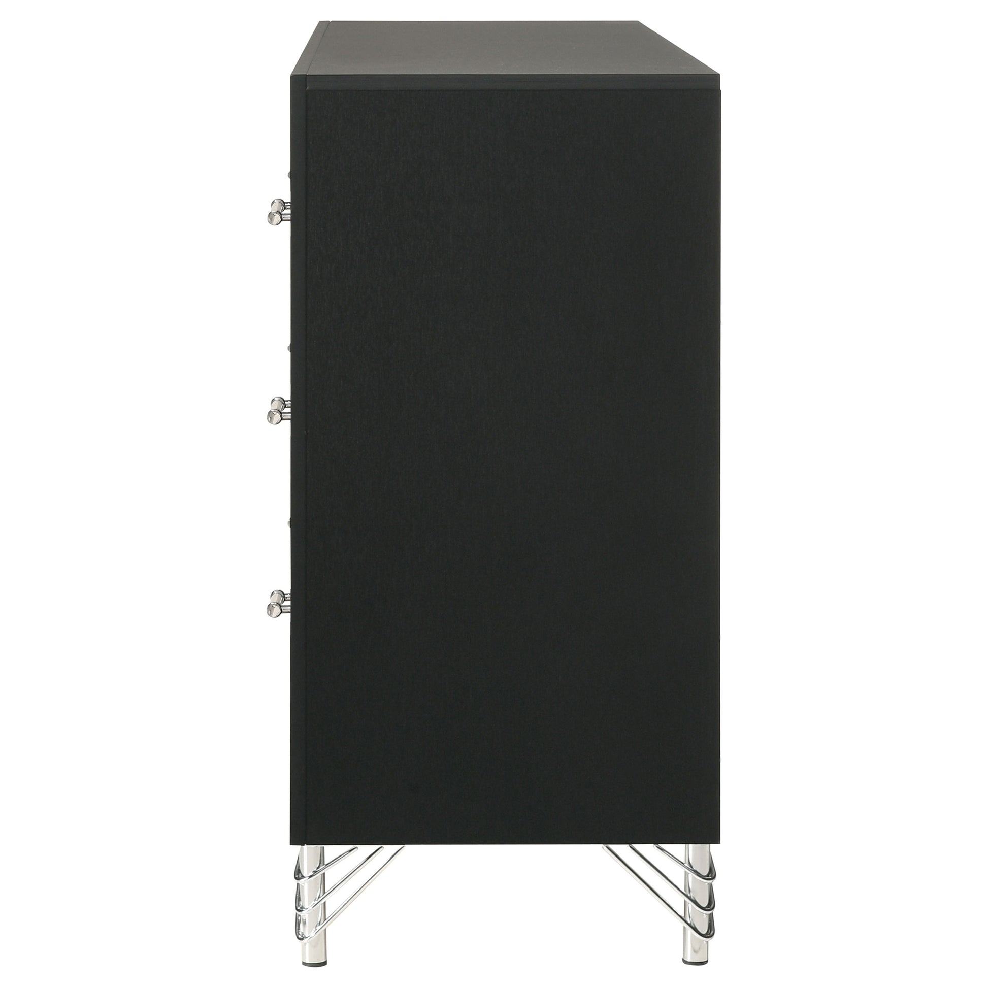 Accentuate surrounding decor with the sophistication of a modern six-drawer dresser. Designed for ample storage, it features a refined look with spacious drawers ideal for everything from clothing to accessories and linens. Its bold black finish is crisp and chic, complemented perfectly with rich, cool chrome trim that gleams in the light. Decorative legs have hairpin inspired style, offering a stylish touch of vintage energy. Long bar pulls complete the look with polished perfection.