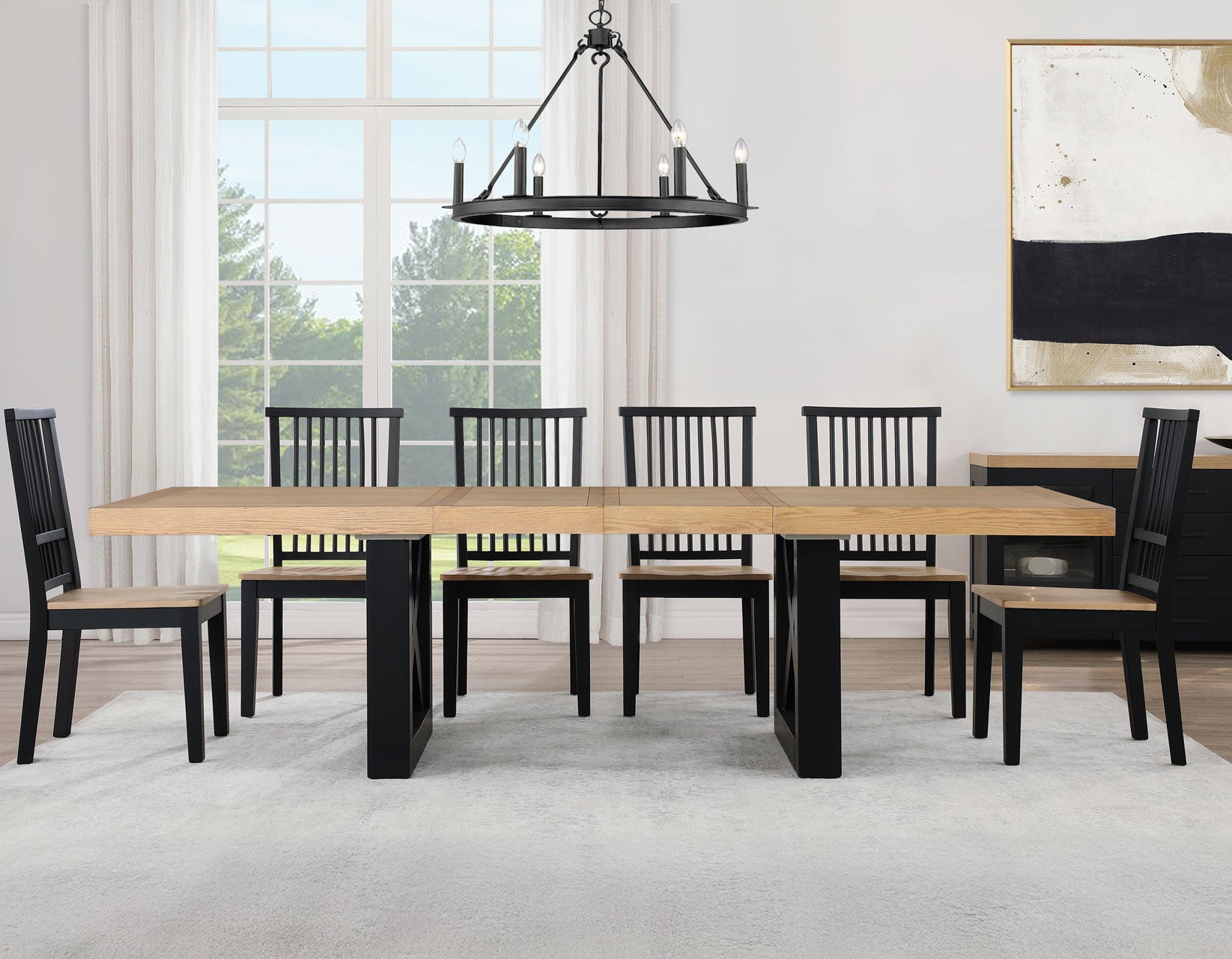 A blend of farmhouse finished and substantial proportions combine in the simple sophistication of the Magnolia dining collection. This 5-piece set contrasts black spindle back chairs with a black table base in a striking combination of neutrals. A naturally finished top unites the different aspects of this generously scaled dining set. The dining table centerpiece of the set starts at 72-inches but expands to a full 108-inches in an instant with the addition of the 2-18-inch leaves for a table that easily accommodates 10 guests for dinner. The clean lines and crisp finishes create a light and airy set perfect for larger dining areas.