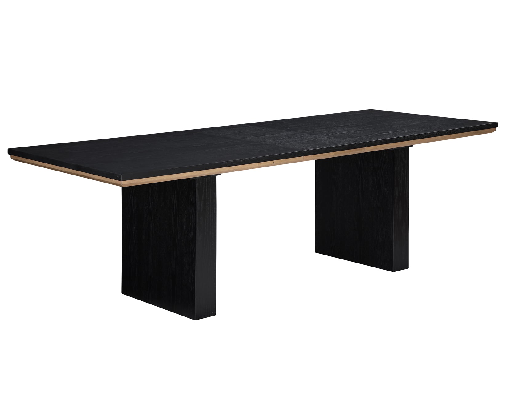 The Magnolia 80-96″ Table brings modern sophistication to the dining room. Clean lines and an expandable top create an elegant centerpiece, complemented by a striking ebony stain with gold accents. Seating up to eight guests, it effortlessly extends from 80 to 96 inches with the included 16-inch leaf. Crafted from oak veneers and Asian hardwoods using mortise and tenon construction, this table guarantees durability and strength. Elevate your dining space with this timeless masterpiece, seamlessly blending style and practicality for unforgettable gatherings.