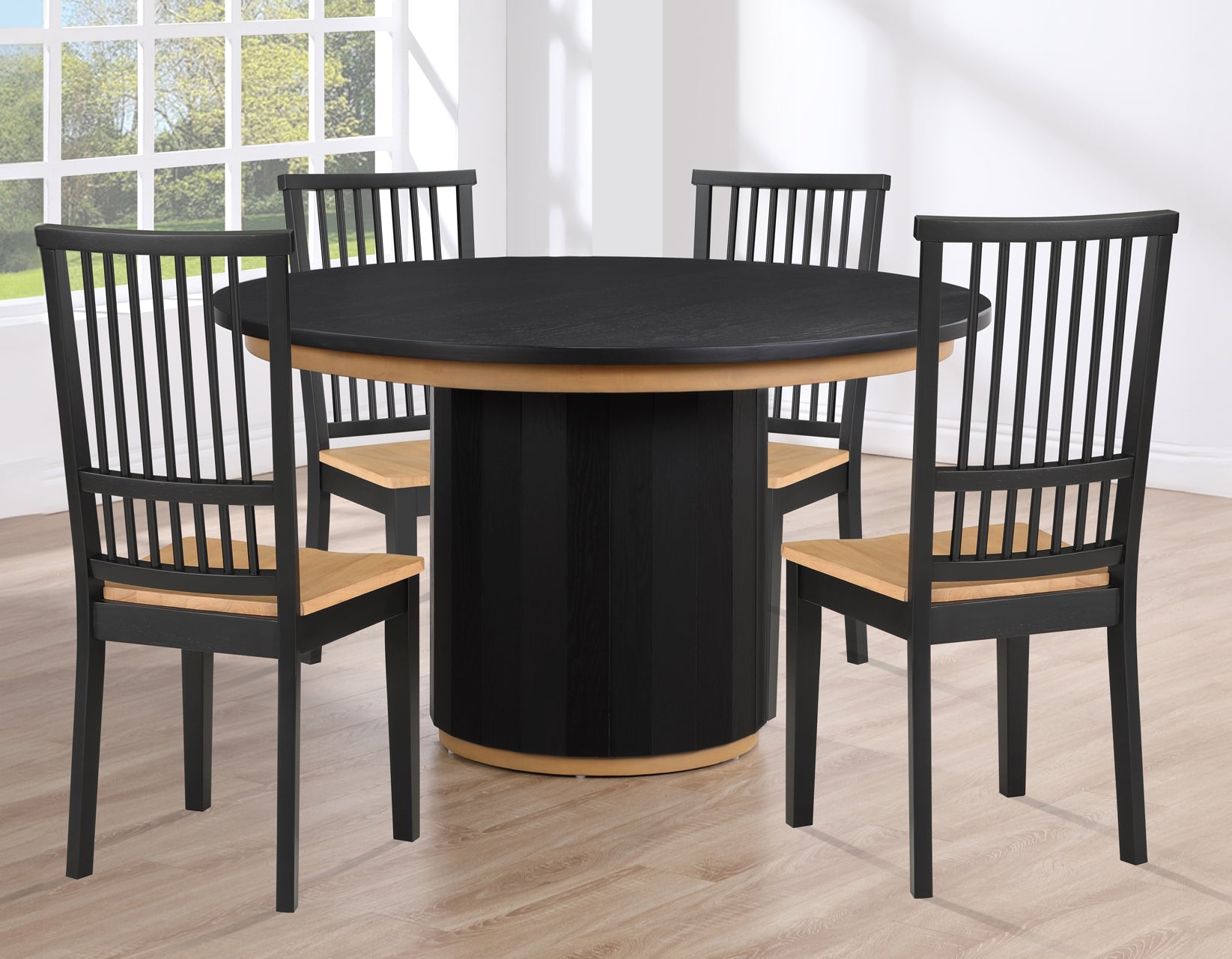 Sophistication meets modern comfort in the Magnolia 5-piece 52-inch round dining set, The focal point is the table, showcasing a lustrous black finish and exquisite gold band accents. Clean lines define the contemporary look, complemented by the two-tone black and natural lyfinished chairs with gracefully shaped wooden seats. This set effortlessly bridges the gap between upscale elegance and casual comfort, creating a modern dining ensemble that is both inviting and refined. Elevate your dining experience with the Magnolia set—an embodiment of style that strikes the perfect balance between chic and relaxed living.