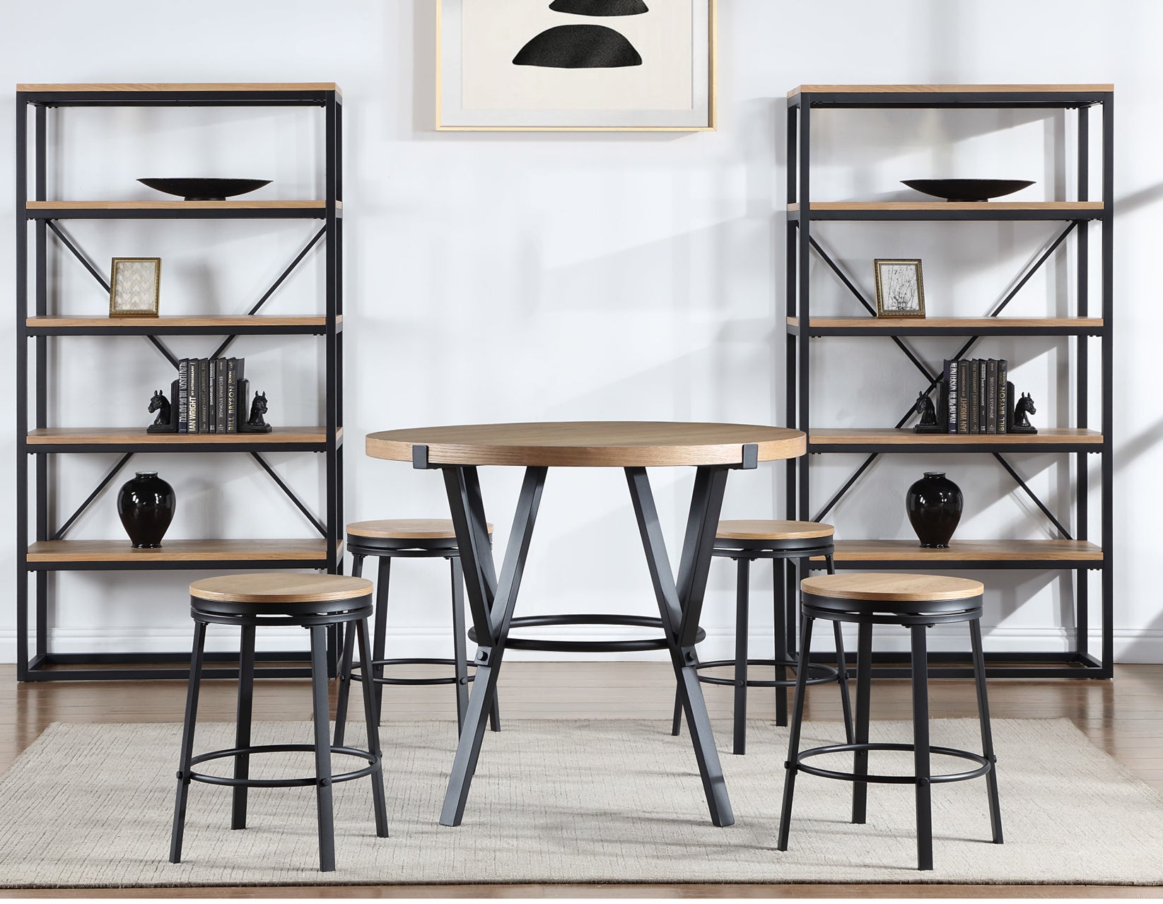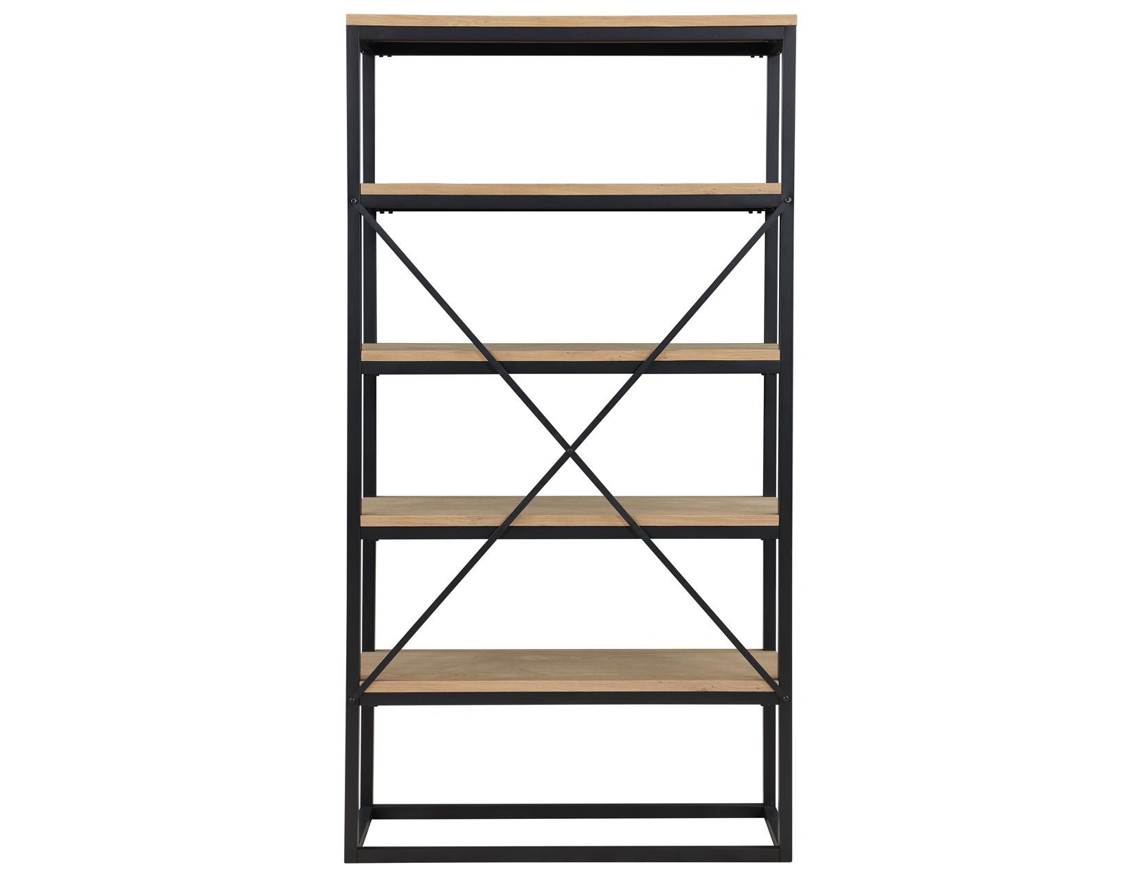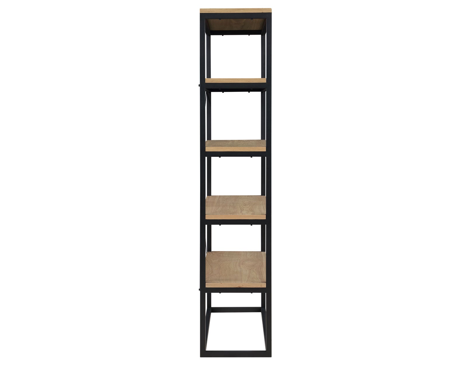 A mixed media bookcase with industrial design bona fides dressed up with a fresh new sand wood finish for today’s interiors. A black metal frame with back stretchers offers sturdy construction and a sleek modern look. Five ash veneered shelvers offer a beautiful contrast while also offering abundant storage for a bedroom, office or dining area.