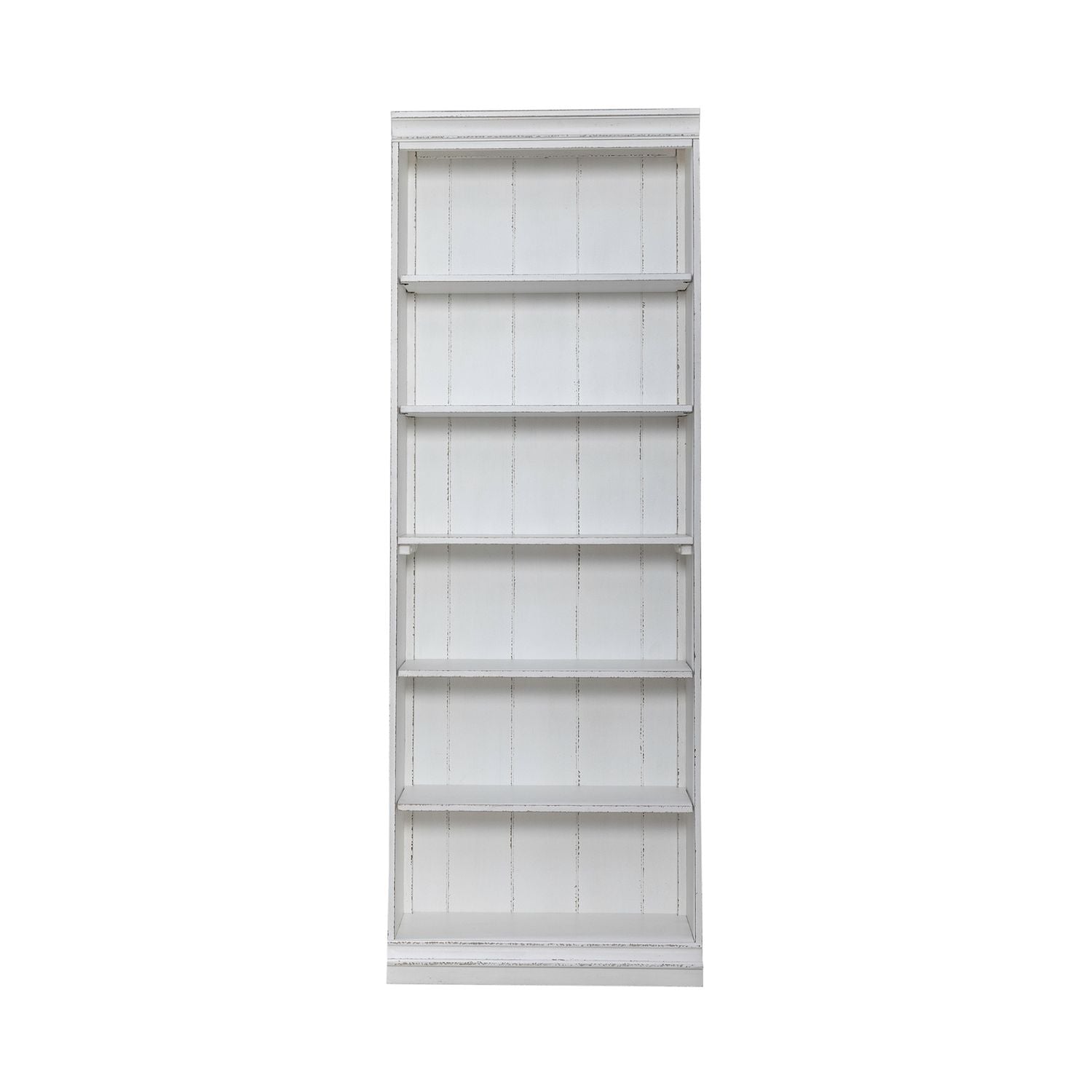 The Magnolia Manor 84 inch bookcase is a timeless piece that seamlessly blends classic design with modern functionality. Crafted with meticulous attention to detail using Rubberwood solids with White Oak and Birch veneers, this piece features an Antique White finish with heavy distressing. The bookcases standout feature is a heavy top and base crown, adding a touch of grandeur and stability to the overall structure. Five fixed wood shelves offer sturdy support for your books, collectibles, and more, while against a planked back panel, providing a rustic backdrop that enhances the bookcase's visual appeal. Designed to withstand the test of time, this bookcase combines durability with elegance, making it a versatile addition to any living room, home office, or study. Whether you're showcasing your favorite novels or organizing important documents, the Magnolia Manor 84 inch bookcase offers both style and functionality in equal measure.