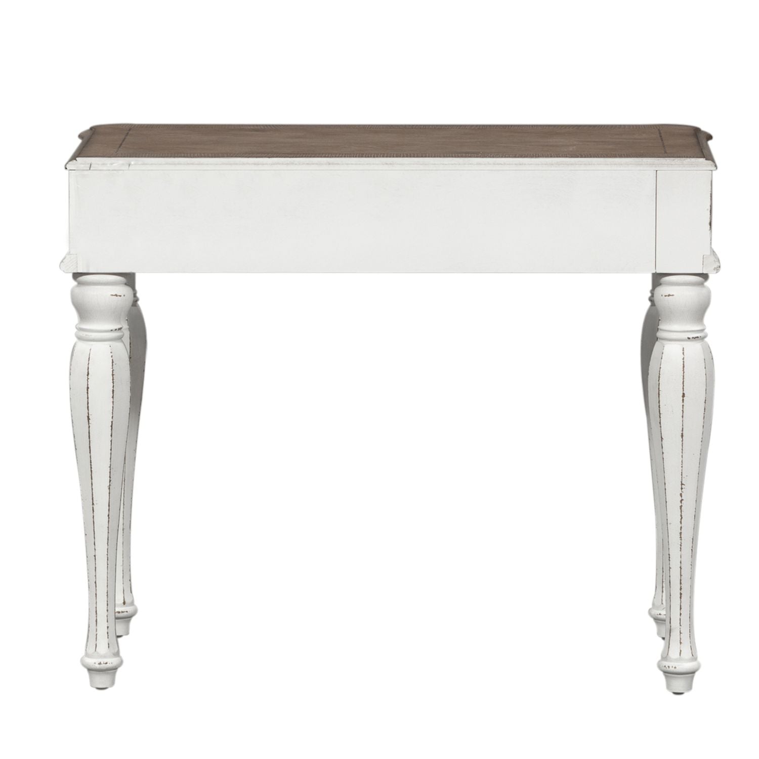 Start your mornings off at your Magnolia Manor accent vanity desk. Crafted of poplar solids with white oak and birch veneers, this piece features the perfect blend of European design, one fully stained full extension drawer that allows for easy access to storage, canted corners, and is accented beautifully by antique pewter knob hardware. Top is finished in a weathered brown with whitewash. Warm antique finishes and artistic distressing along with grand scale create a piece to be passed to generations.