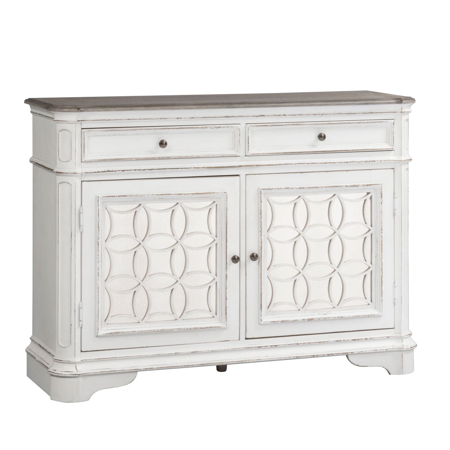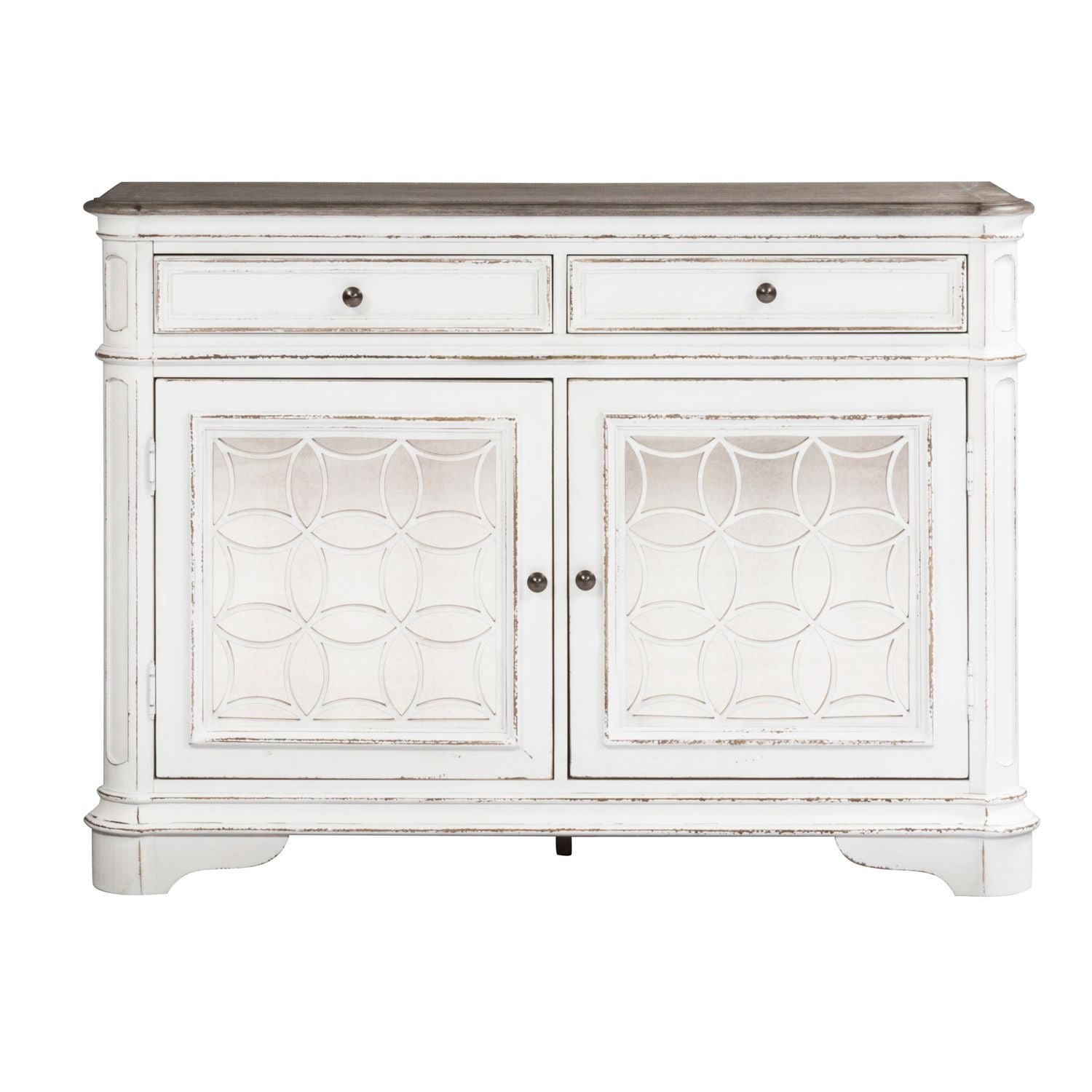 Make entertaining easy and stylish with the Magnolia Manor Buffet. Crafted of poplar solids with white oak and birch veneers. The buffet top features a weathered brown finish accented by an antique white with heavy chipping. Two fully stained full extension drawers with felt lining create storage galore when combined with the two antique mirrored doors that feature one adjustable shelf behind each doors. The mirrored doors offer design flexibility with a decorative grid insert and the option to switch the mirrored door to a wood panel. Canted corners and bead molding round out this beautiful piece that works in any decor from farmhouse to cottage living.