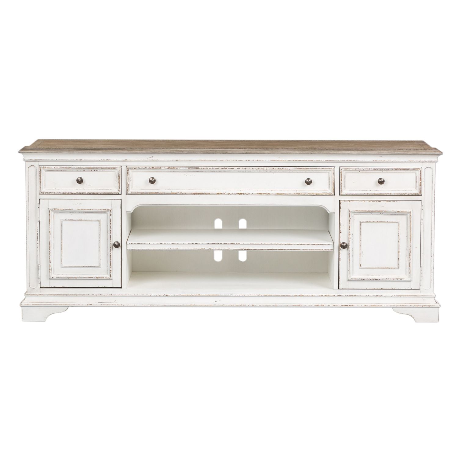 This European traditional styled 70" tv stand is sure to be the focal point of any living room and can accommodate most 75" TVs. Crafted with poplar solids and white oak and birch veneers, this piece features an antique white finish, wood framed drawer fronts, and adjustable shelf space. This tv stand must be sold with the wall unit, as it cannot stand alone. With today's modern technology in mind, users can enjoy the convenience of the wire management provisions to hide those pesky wires from your DVD player or gaming console of choice.