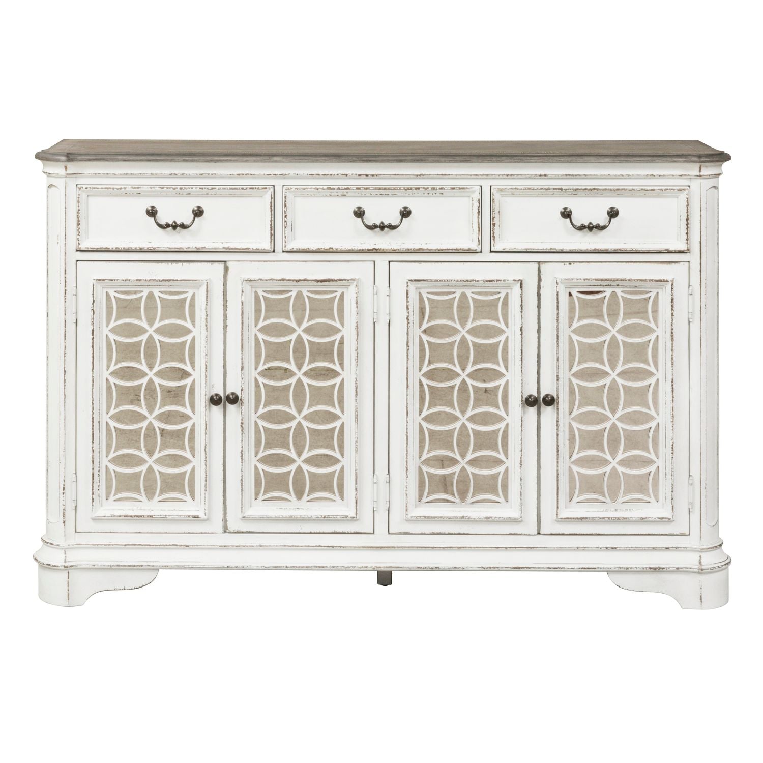 Make entertaining easy and stylish with the Magnolia Manor Hall Buffet. Use this piece in the entryway as a statement piece or as a hosting buffet in your dining room. Featuring a blending of European influences the hall buffet is crafted of poplar solids and white oak veneers finished in a weathered brown and antique white finish with heavy chipping. Four doors create a unique design opportunity with an overlay grid pattern that will work with the mirrored panel or wood tone panel for two completely different looks. Behind the doors are 4 adjustable shelves for storage. The case is rounded out with three drawers that feature full extension drawer guides and a fully finished interior.
