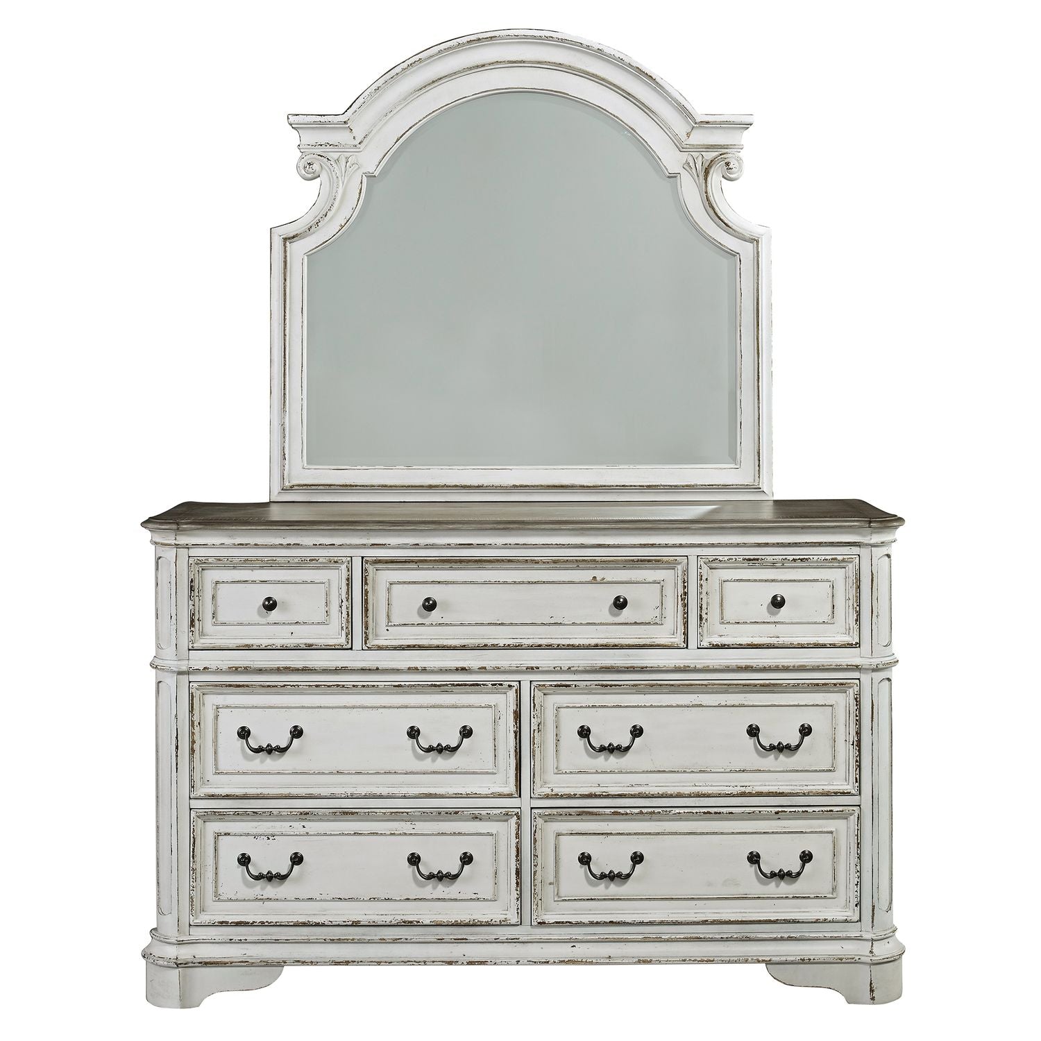 Opt for an elegant display. A refined yet relaxed feel describes the Magnolia Manor California king panel bed, dresser, mirror, chest, and nightstand. Crafted of poplar solids with white oak and birch veneers, this kit features an antique white finish with heavy artistic chipping. The bed offers arched crowning and dog bone accents on each corner effortlessly adding both definition and character, completing your look. The dresser and mirror duo are the perfect way to accent your room. Weathered brown whitewash tops paired with the antique white finish creates a truly unique look. Softness is added to the design with canted corners and rounded pilasters, accompanied by bead molding on each drawer front. The dresser, chest, and nightstand feature full extension drawer glides for easy access to storage, fully stained interior drawers, felt lined top drawers, framed drawer fronts, and dust proofed bottom drawers that are accented by antique pewter bail and knob hardware. Take advantage of the built-in charging station on the nightstand, complete with two electrical outlets and two USB ports. Warm antique finishes and artistic distressing along with grand scale creates a group to be passed to generations.
