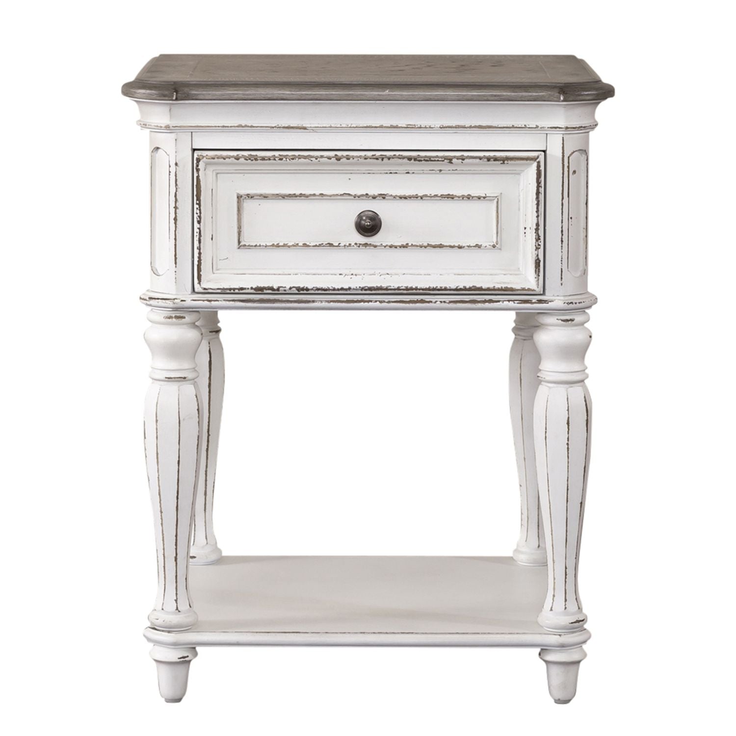 This open night stand is the perfect way to accent your room with an effortless blend of European Traditional design. Weathered brown whitewash top paired with the antique white finish creates a truly unique look. Softness is added to the design with canted corners and rounded pilasters, accompanied by bead molding on each drawer front. The night stand features a felt lined top drawer and bottom case dust proofing that is accented by custom antique pewter bail and knob hardware. Maximize storage with the convenient bottom shelf, perfect for storing your everyday items.