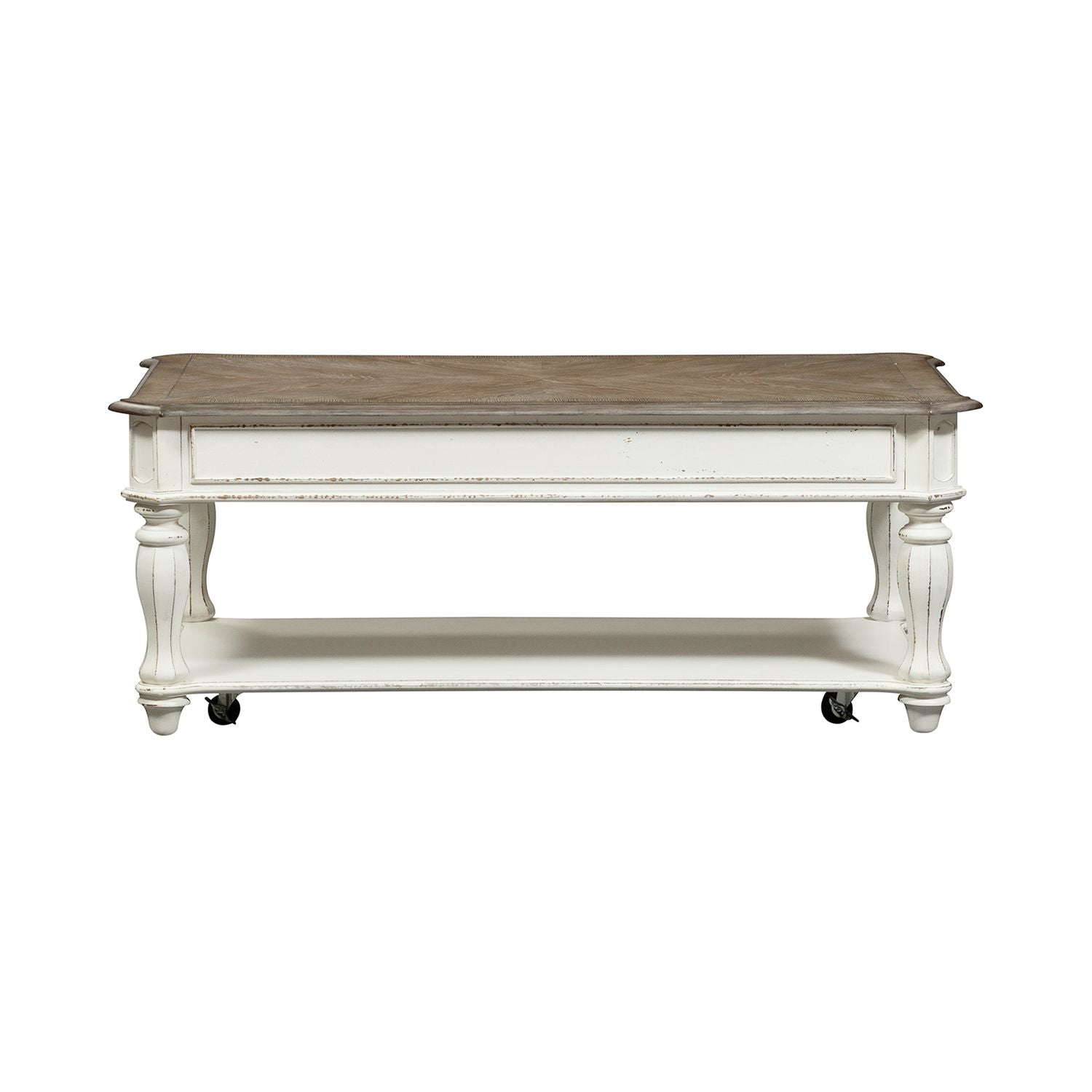Accent your space with the perfect blend of European design with the Magnolia Manor lift top cocktail table. Crafted of poplar solids with white oak and birch veneers, this piece features a fancy face top in a weathered brown with whitewash, wood framed drawer fronts, bead molding, canted corners, casters that make rearranging a breeze, and a lift top that extends to 30", revealing additional storage. Users can enjoy the added storage for items from magazines, to cozy throw blankets with the bottom shelf. Warm antique finishes and artistic distressing along with grand scale create a piece to be passed to generations.