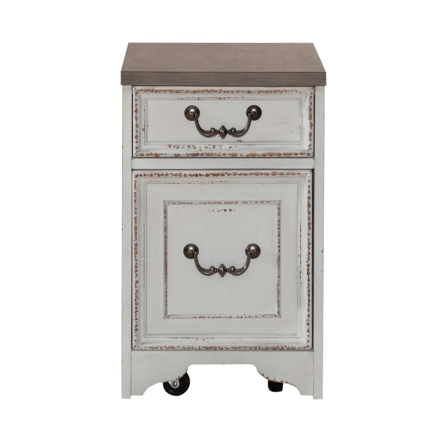 It’s never been easier to be elegant with the Magnolia Manor mobile file. Crafted of poplar and rubberwood solids with white oak and birch veneers, this piece features an antique white finish with heavy chipping and distressing with a weathered brown top with whitewash. This piece has two full extension wood framed drawers, including the bottom drawer that can be used to store files. Antique pewter bail pull hardware accent this piece, and casters allow for easy mobility. Blending of European influences makes Magnolia Manor a truly unique style for any home.