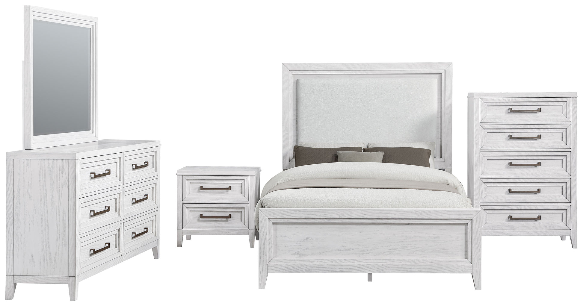 Distinctive hardware and layered trim work create a refined but dimensional effect for a five-piece modern bedroom set. In distressed white with wood grain texturing, it's a complete set that includes an upholstered bed with a padded headboard, two-drawer nightstand, five-drawer chest, and six-drawer dresser and mirror. It delivers ample storage and easy organization in a cohesive bedroom ensemble. The bed features a contemporary, open silhouette with a tall headboard and low footboard. Add colorful linens for a fresh look or stick with crisp white for a soothing monochromatic effect.