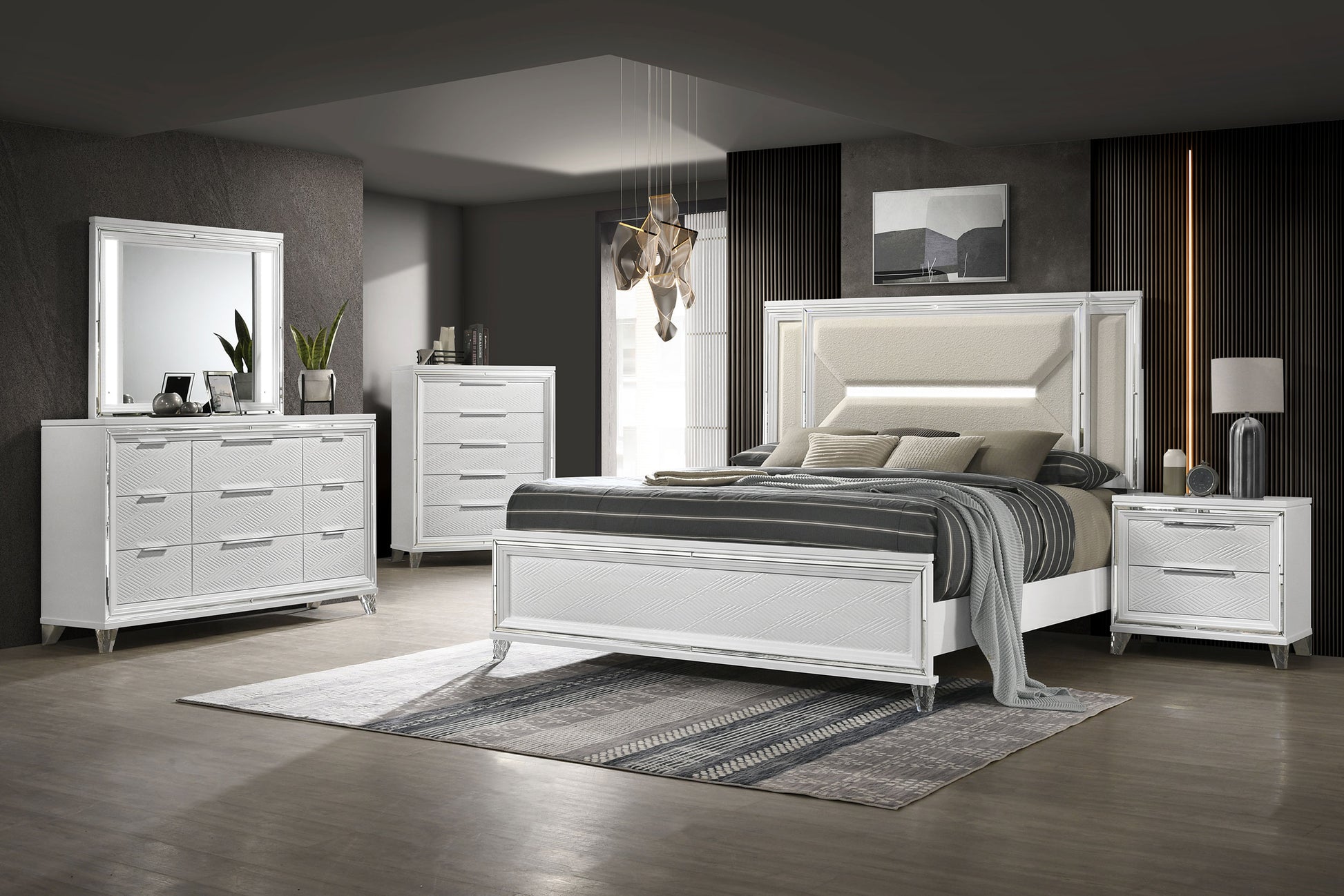 Complete your bedroom ensemble with this elegant 2-drawer nightstand, designed with a modern Italian aesthetic. The white finish, accented with mirror framing and polished chrome metal hardware, creates a striking look. Featuring picture framed recessed panels with an embossed herringbone graphic pattern, this nightstand offers both style and functionality. The top drawer includes cord management access, making it perfect for your rechargeable devices. Crafted from rubberwood, MDF, and mirror, this nightstand is a luxurious addition to any bedroom.