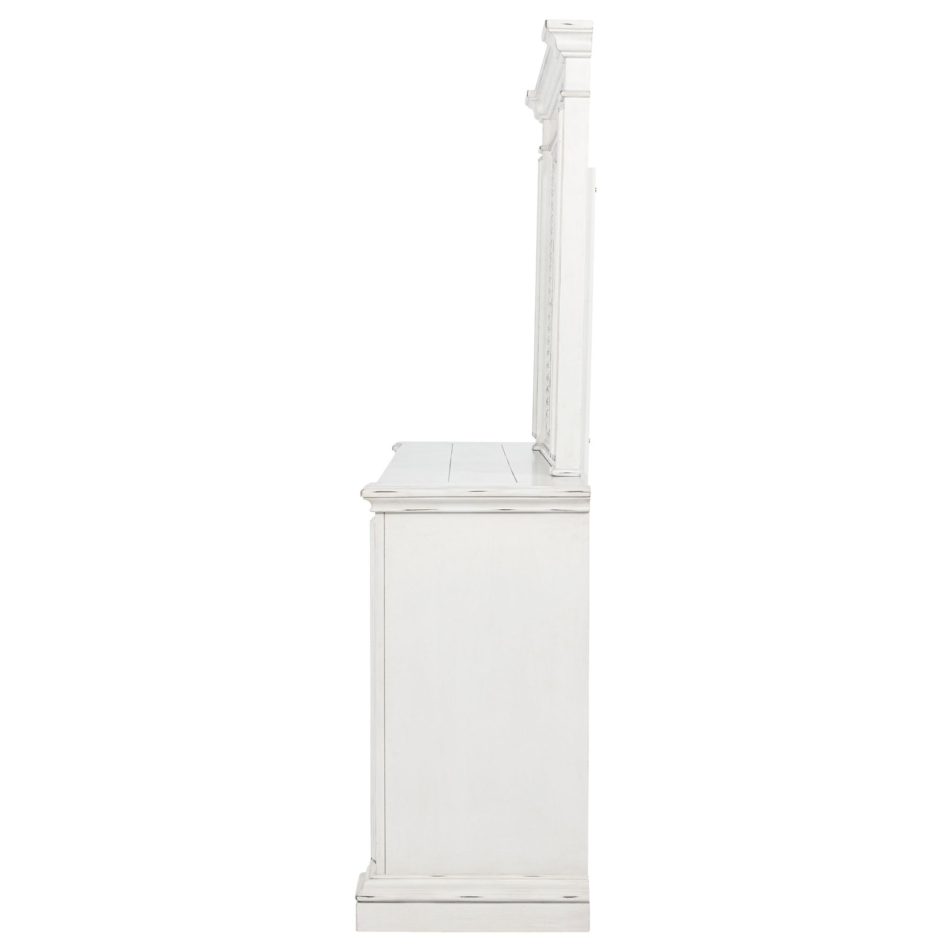 Rooted in traditional elegance, this dresser and mirror set brings vintage charm and refined detail to the bedroom. Framed with ornate carvings and softened by a distressed white finish, the six-drawer dresser offers ample storage with thoughtful touches—including a hidden jewelry tray in the bottom drawer. Antique bronze pulls and crown molding complete the look. Crafted from poplar and engineered wood, it’s designed with both beauty and function in mind.