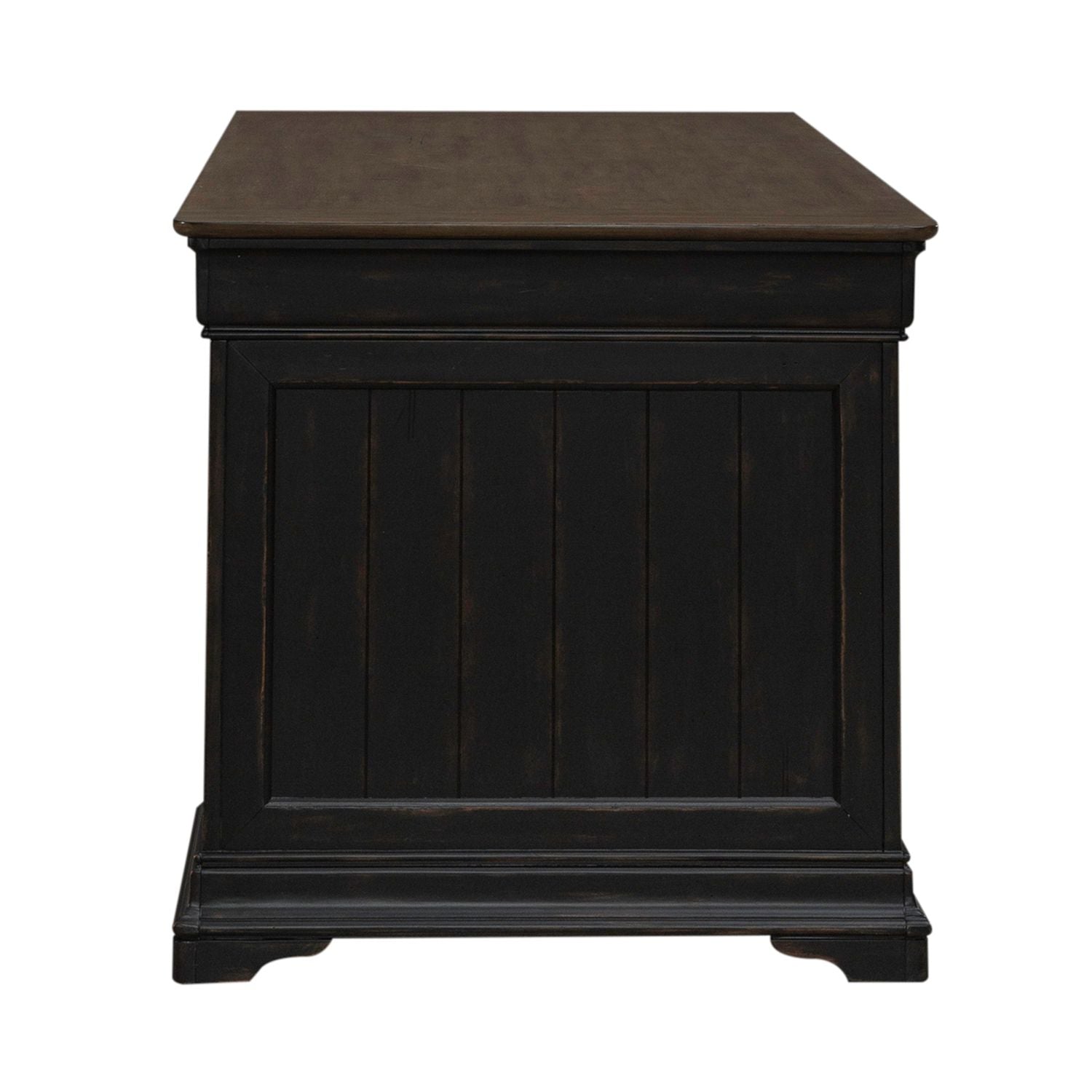 Creativity starts with the Meritage jr. executive desk. Meticulously crafted using Poplar solids with Birch and Maple veneers, this piece features an Aged Charcoal with rub thru and Caramel finish. There are seven drawers with wood-framed fronts, each drawer is designed to provide ample storage space while exuding timeless charm. Among these, two locking file storage drawers offer added security and organization for your important documents. Also included is a flip down keyboard drawer offering a seamless solution for your typing needs while ensuring efficient wire management. The desk is further distinguished by its heavy base molding, which not only adds structural integrity but also lends a refined finish to the piece. Completing the look are the Antique Pewter bail pull and knob hardware, providing a tasteful contrast and enhancing the overall traditional-inspired allure of the desk. Make an impressive statement with the Meritage jr. executive desk.