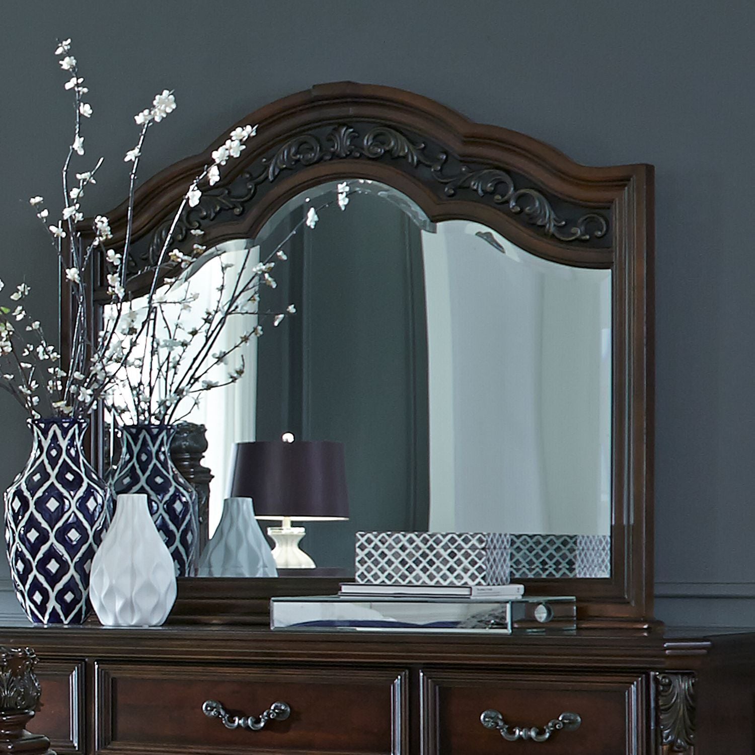 Enhance your room while obtaining an elegant European style with this Messina Estates arched mirror. The cognac finish is accented by bead molding and scrolled metal accents. The beveled mirror adds a traditional touch to the piece.