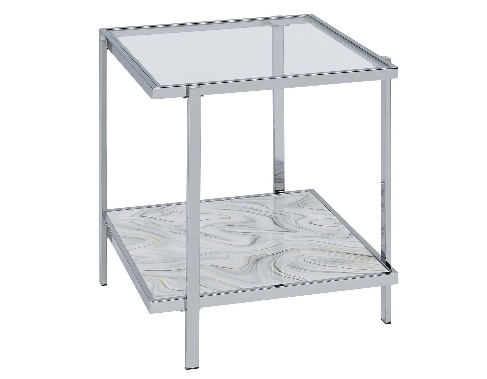 The Mika End Table brings a captivating blend of gray, bronze, and yellow hues in a stylized faux-stone finish to your living space. Chrome and glass combine with an Art Deco swirled glass base to create a sparkling and enticing piece. Customize the look by placing the faux-stone insert on either the top or bottom shelf, with the tempered glass insert on the other. This table enhances other accent colors in the room and features a bottom shelf, making it perfect for storage or display. Great beside a chair or between upholstered pieces, it adds a touch of glamour and functionality to your home.