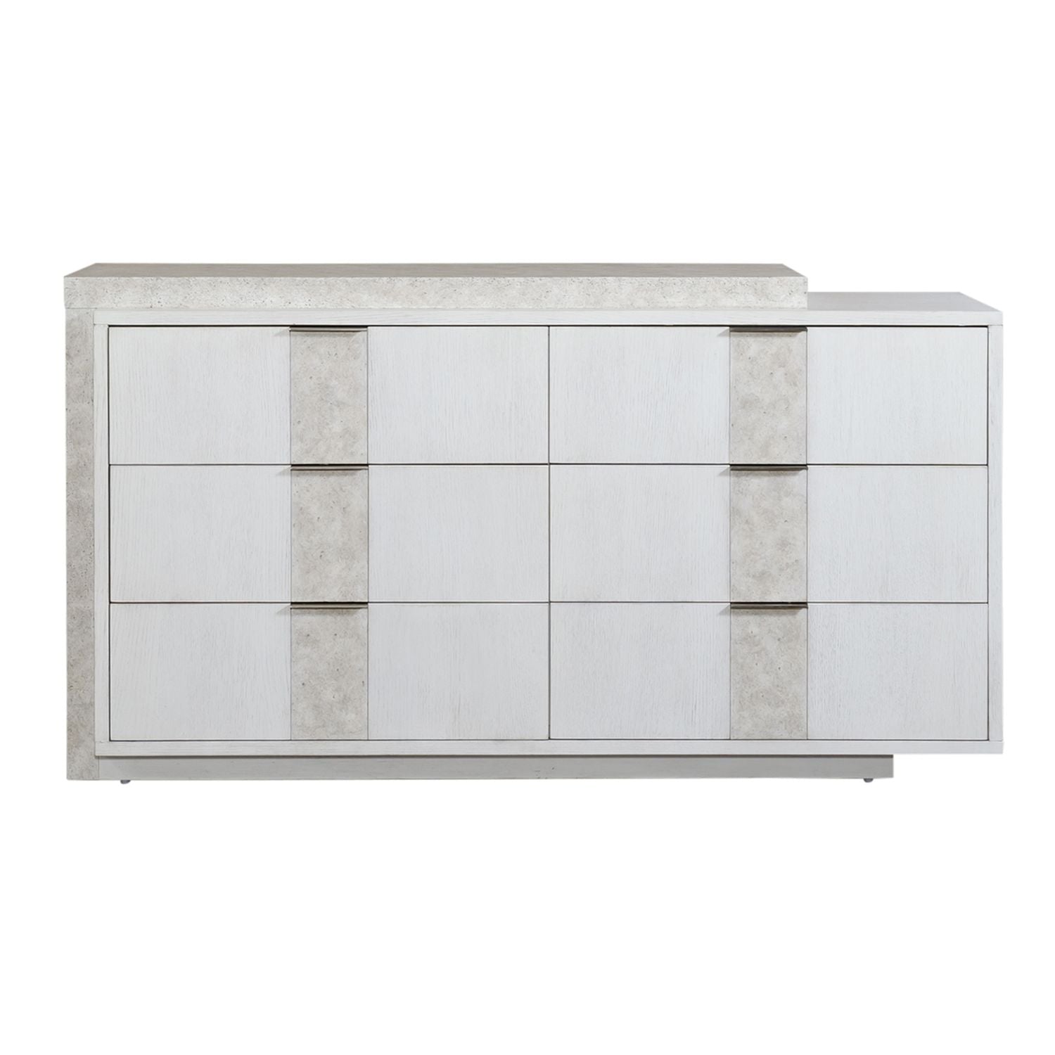 Add a contemporary feel with the Mirage 6-drawer dresser. The white finish is highlighted by wire brushing, faux travertine inserts, and satin nickel hardware. Oranize your clothing in the full extension drawers, with the top drawers being felt liend and the bottom drawers being cedar lined. All drawers are equipped with dust proofing to protect your belongings.