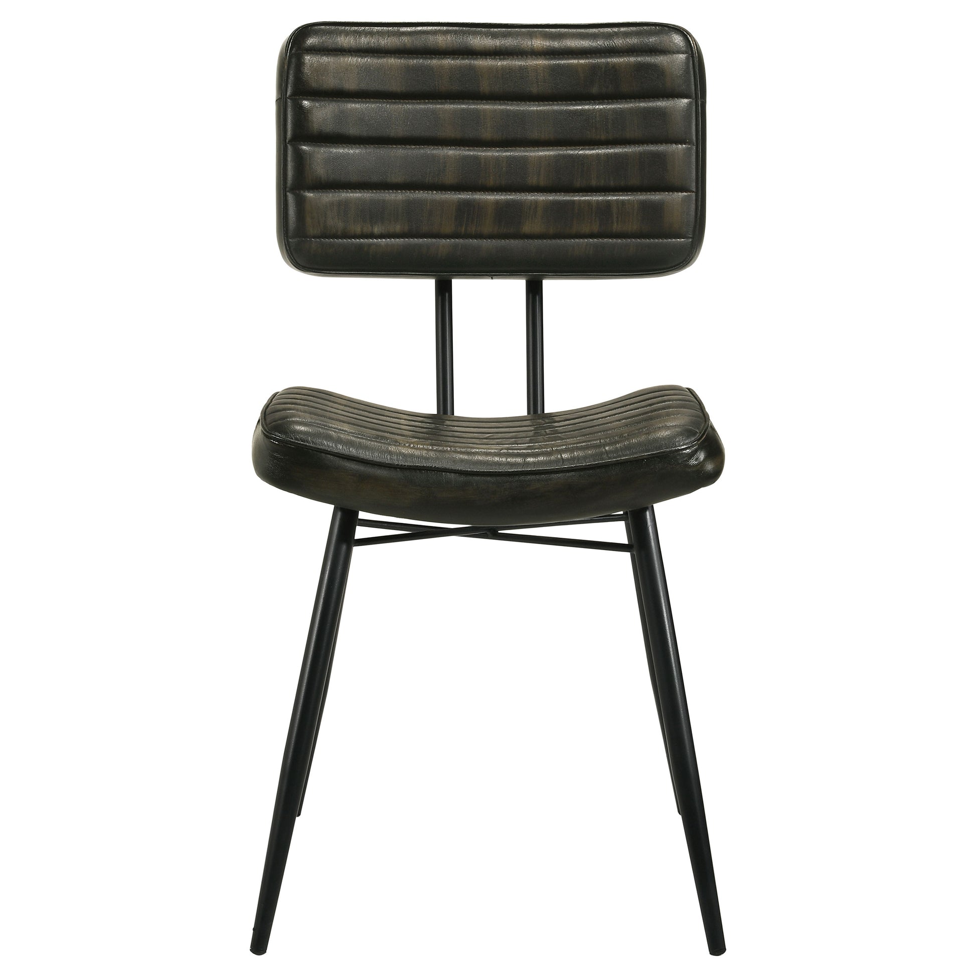 Blending industrial edge with vintage charm, this dining side chair is a striking addition to any dining space. Upholstered in hand-dyed genuine goat leather, the padded seat and backrest offer both comfort and durability. Vertical tufting details enhance texture and create a refined look, while the flared and tapered metal legs in a deep black finish provide sturdy support with a sleek contrast. Designed for long-lasting appeal, this chair brings a sophisticated yet rugged aesthetic to modern, industrial, or rustic interiors.