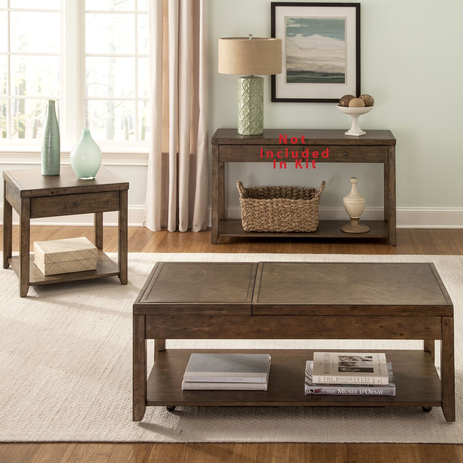 The Mitchell collection gives casual traditional stye with clever functionality. Crafted of poplar solids and cedar veneers with a nutmeg finish. Features four-way fancy face veneer top, one pull-out drink trey on the cocktail table with black laminate top for protection, antique brass knob hardware, one drawer in the end tables, a bottom shelf for additional storage, casters for easy moveability, with block tapered legs. Cocktail table offers a lift top great for working from home or enjoying a snack and the other half has a flip top that reveals an upholstered seat which can be used for extra sitting or ottoman. This collection will make life easy with all its features. Kit consists of one cocktail table and two end tables.
